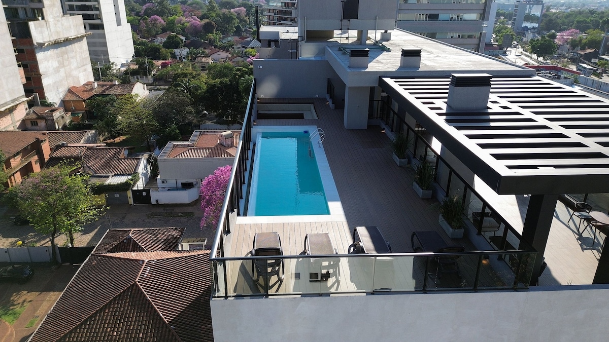 Elegance, comfort, and a privileged location. Just 10 minutes from Silvio Pettirossi Airport and steps away from Shopping del Sol and Paseo La Galería. Relax with modern views and enjoy the coworking space, gym, and pool. As a guest, you’ll receive a 20% discount at the building’s café.