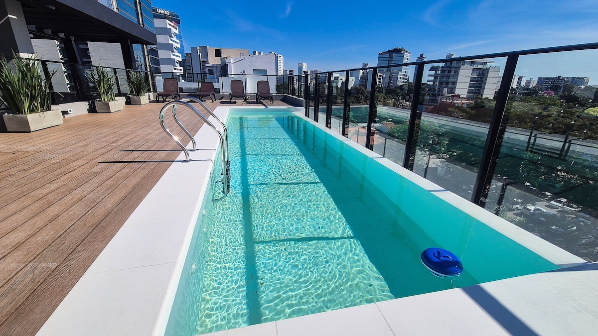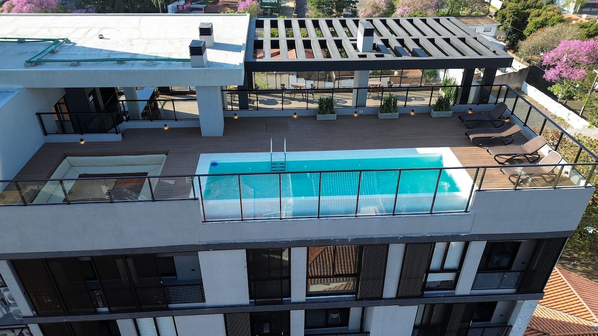 Experience Asunción from its best location. This modern and bright apartment is just 10 minutes from the airport and steps from Shopping Paseo La Galería and Shopping del Sol. Enjoy the pool, gym, and a 20% discount at the building’s café — perfect for your breakfasts. Ideal for discovering the city with comfort, style, and a privileged location.