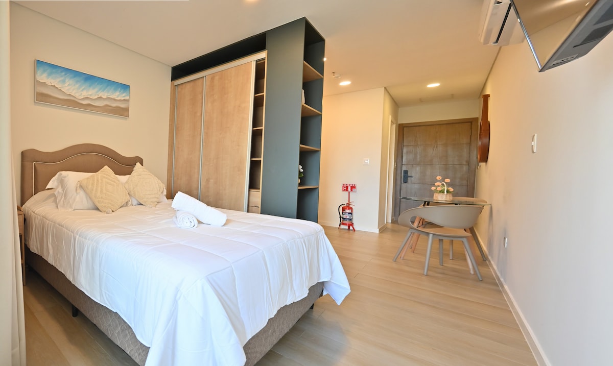 Stylish Studio in Rentalis Villa Morra Modern studio in a new building, steps from Villa Morra & Mariscal López Shopping, Food Park, grocery stores, top bars & restaurants Perfect for couples or business travelers. Includes AC, washer/dryer (rare!), microwave, hot/cold water filter, coffee maker, blender, fast Wi-Fi, smart TV, cable, work desk, and spacious balcony Access to rooftop, pool & gym. Early check in and late check out available for $25 All guests must be registered on the Airbnb