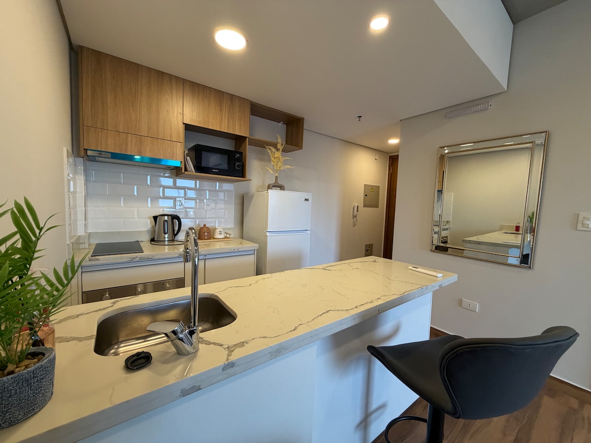 Departamento nuevo a estrenar en edificio lujoso. Tiene 40m² propios, con Smart TV, WIFI, y en el edificio tenes todos los amenities: Piscina , Quincho climatizado con parrilla, Sala de juego de niños, gimnasio equipado, etc Queda a 5 minutos en auto del centro corporativo mas valorado de la capital, y a 25 minutos caminando. Tambien queda a 11 minutos en auto al aeropuerto Silvio Pettirossi Tiene una cama matrimonial + un sofa cama. En total se pueden hasta 3 personas para dormir.