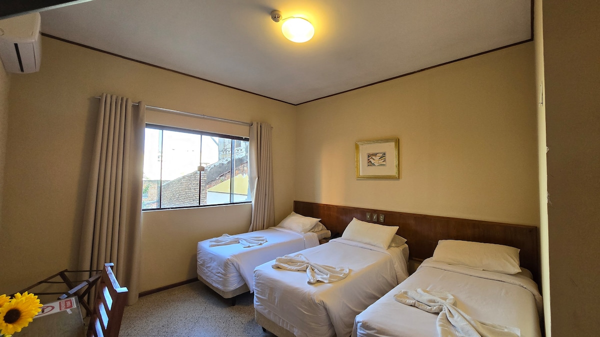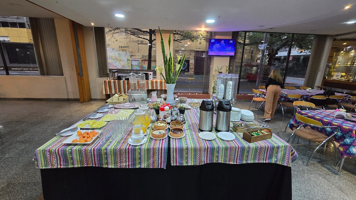 El Hotel esta ubicado en el centro mismo de Asuncion en casco historico cerca de todas las dependencias publicas, y lugares de eventos en Asuncion. Las tarifas incluyen desayuno desde las 06:30 a 09:30 horas contamos con piscina, gimnasio, estacionamiento privado.