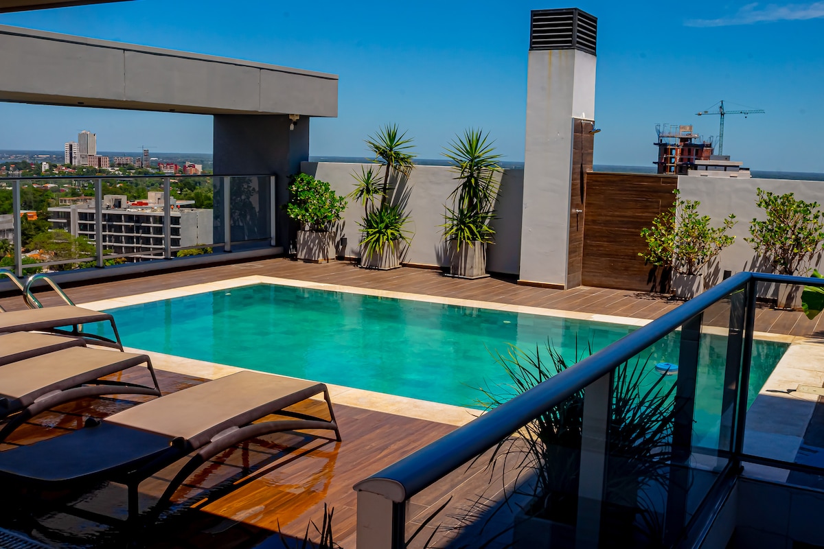 Departamento tipo loft, totalmente privado e independiente. Decoración sobria con excelente iluminacion y climatizado. Con escritorio para personas que vienen con fines laborales. Próximo al nuevo eje Corporativo y Comercial de Asuncion. Posee una amplia terraza con piscina, galeria con parrilla y gymnasio.