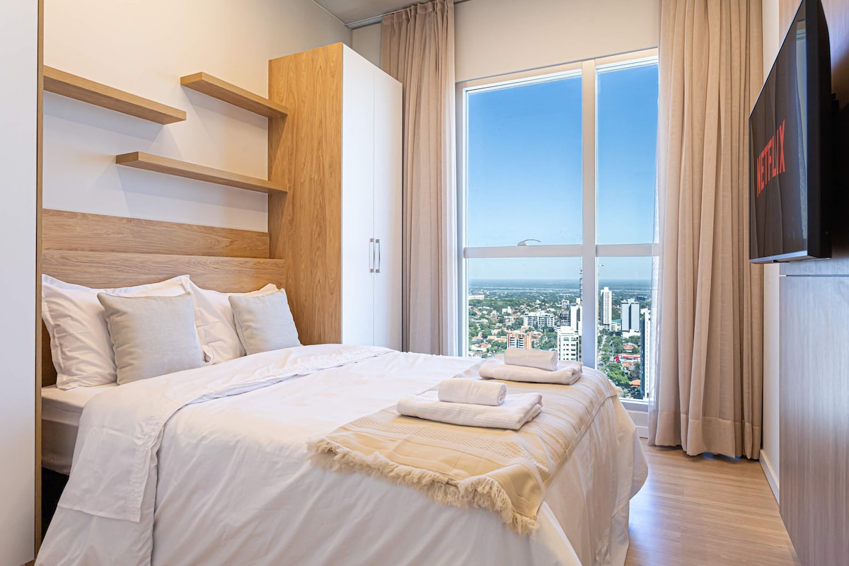 Stay in Paraguay’s tallest tower with full hotel-style comfort. This modern apartment offers stunning skyline views, premium furniture, high-speed WiFi, smart TV, and a fully equipped kitchen. Enjoy 24/7 security, fast elevators, and an unbeatable location near top restaurants, cafés, malls, and corporate centers.