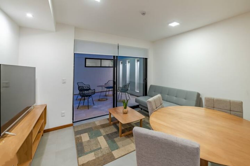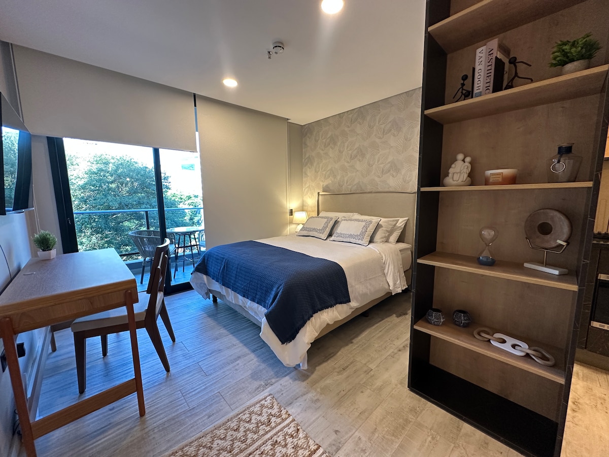 Modern studio apartment in one of the best areas. Half a block from Shopping del Sol, 3 minutes from Paseo La Galería, and 12 minutes from the airport. Easy access to restaurants/supermarkets/offices. Has a Queen bed, Smart TV, air conditioning, WiFi, a fully equipped kitchen, and a private balcony. Access to common areas such as a coworking space, laundry room, pool, gym, sauna, and spa. Parking is not included, but can be rented within the building for USD $10 per day, subject to availability.