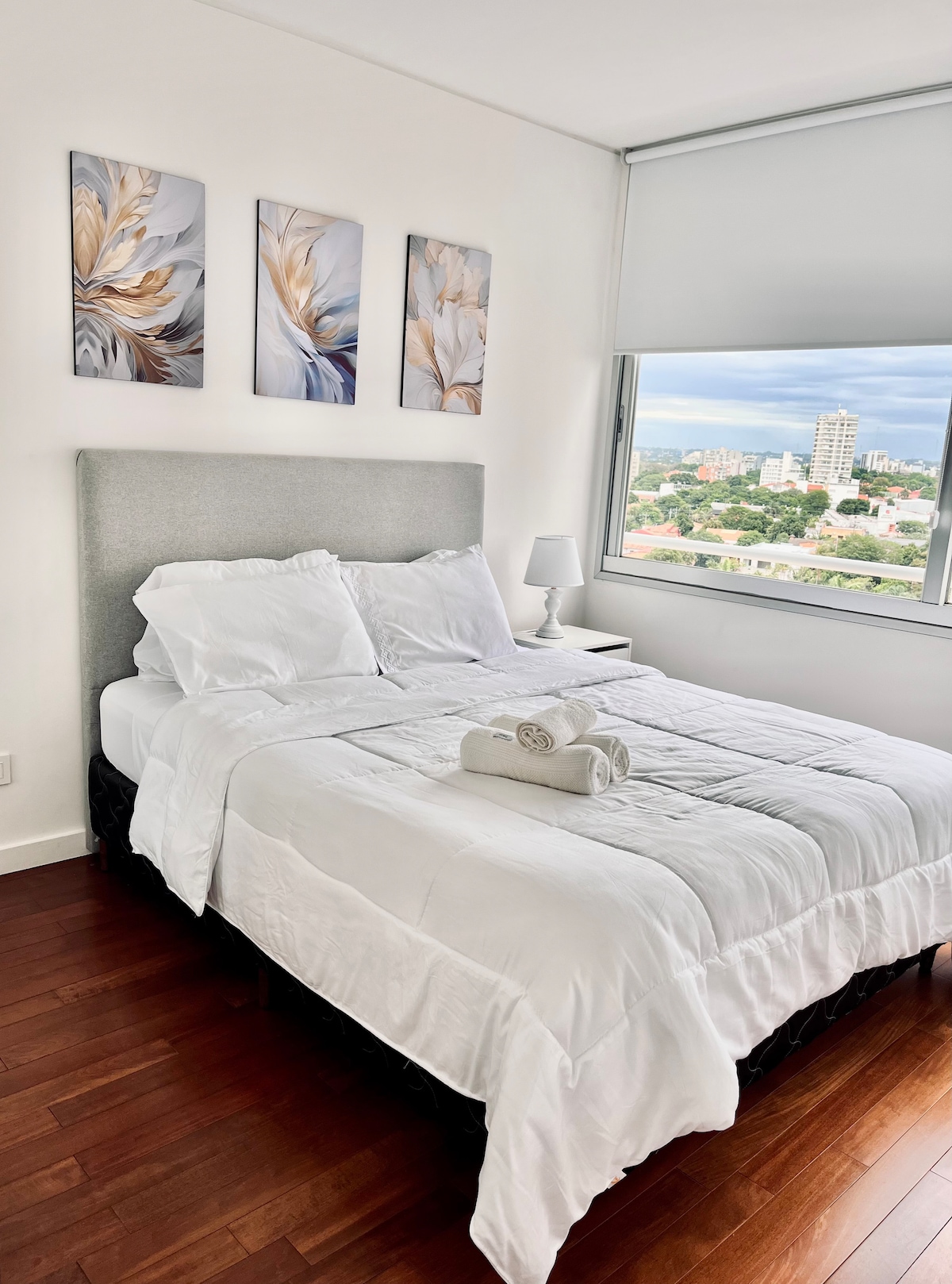 Departamento súper equipado en zona residencial, con balcón y parrilla, hermosa vista y amenities premium: - Piscina con solarium - Piscina climatizada - Sauna - Gym en altura - Rooftop + Quincho - Laundry - Seguridad 24hs - Cochera Excelente ubicación: - A 7 minutos del Eje Corporativo, Shopping del Sol y Paseo La Galería - A 10 minutos de la Costanera y el Puente Héroes del Chaco - A 15 minutos del Aeropuerto Silvio Pettirossi Cuenta con Wi-Fi, Smart TVs y colchones firmes de alta densidad