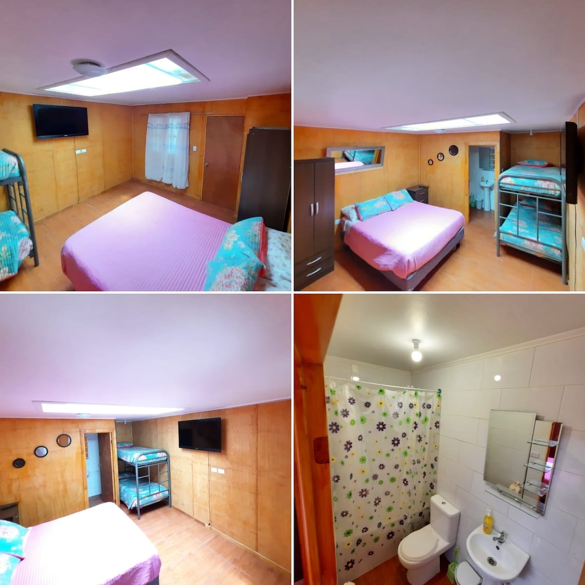 Cabaña equipada para 04 personas y habitaciones con baño privado para 01 y 02 personas, WiFi, agua caliente, tv satelital, restaurant, acceso independiente, aseo.