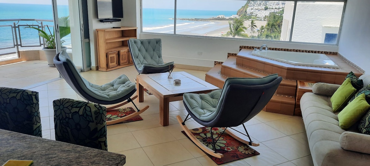 Disfruta de una suite moderna con Aire Acondicionado en el primer piso, con acceso directo al mar y rodeada de tranquilidad. Ideal para parejas, familias y jóvenes que buscan relajarse en un ambiente privado y seguro. Cuenta con una amplia terraza con pérgola de teca para disfrutar del paisaje y la brisa marina. Además, incluye acceso a piscina, canchas deportivas, un deck-mirador y seguridad privada. Ubicada cerca de restaurantes y lejos del ruido, es perfecta para desconectarte y disfrutar.