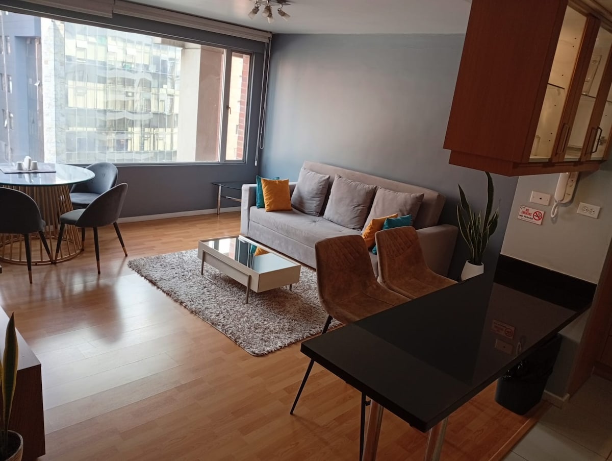 El departamento tiene Vista Espectacular, y Ubicacion Estrategica. DORMITORIO Cama Matrimonial escritorio Smart T.V. de 32" Closet BAÑO completo SALA COMEDOR 2 sofás grandes Mesa de comedor y 4 puestos COCINA Totalmente equipada CUARTO Lavadora/Secadora incluído TODO ESTA CERCA A PIE - Centro Historico - Casa de la Cultura - Universidades - Bancos - Supermercados - Farmacias - Parques - Transporte - Restaurantes - Guardias Seguridad 24/7 - Café, té,azúcar,sal,aceite, pimienta