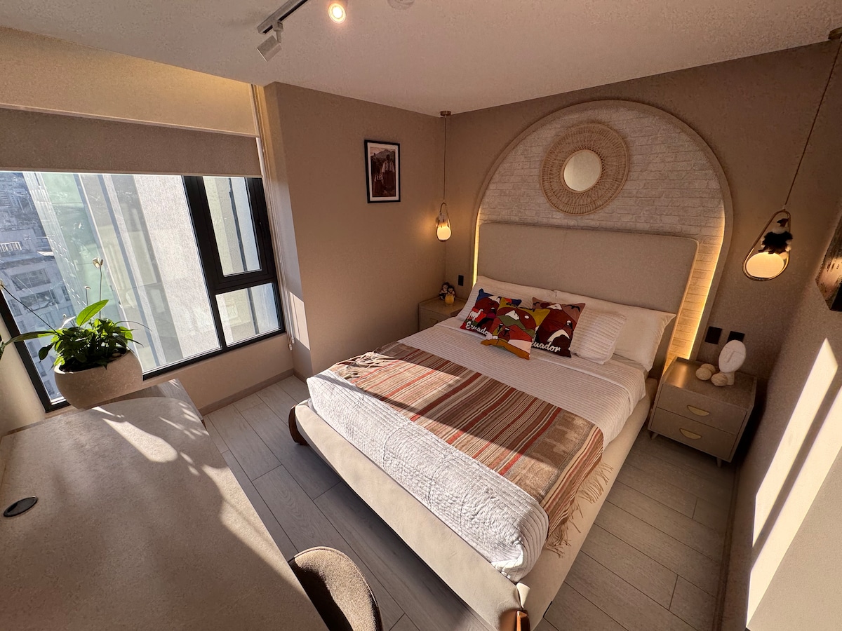 Perfecto para tu aventura en Quito!! Este loft de 80m² combina una ubicación inmejorable con un diseño espectacular diseñado para quienes buscan amplitud y estilo. Sus ventanas panorámicas te conectan con la energía de Quito desde la comodidad de tu sofá. Cerca a Parque La Carolina, centros comerciales o disfruta de la vida nocturna y gastronómica sin necesitar taxi. Excelente iluminación y WiFi rápido. Totalmente equipado con todo lo que necesitas para sentirte cómodo desde el primer minuto.