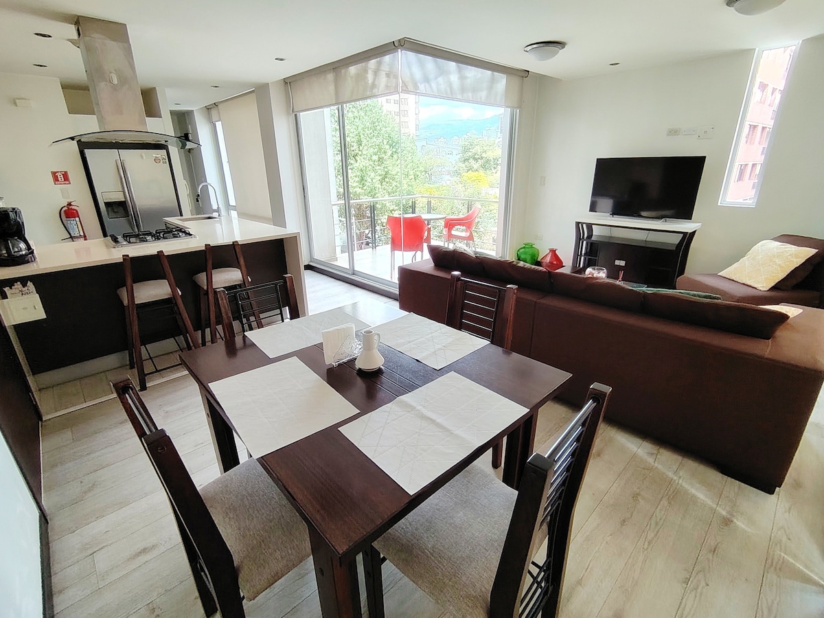 El departamento tiene: cerradura inteligente y acceso con código, cocina, nevera, lavadora y secadora, horno,cocina, bebedero de agua La sala tiene TV de 60" 4K con dirextv Tv, apple TV, netflix, Wifi de alta velocidad 300 mb, un sofá cama, las cortinas son eléctricas, la habitación tiene sábanas, cobijas, cobertores, mantas y toallas nuevas , calentadores electricos, TV de 55" en el dormitorio y con un patio con sillas y parasol privado. Se implemento un vidrio acústico para confort auditivo