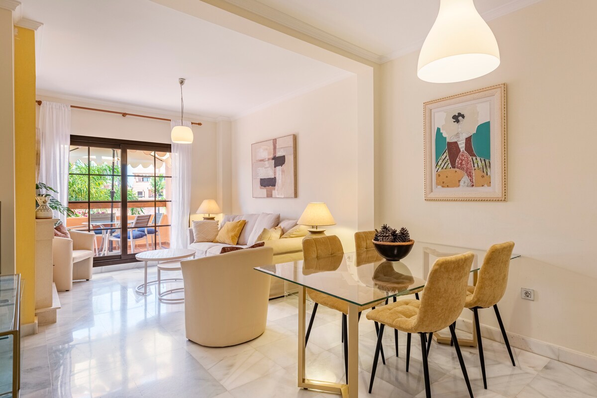 This spacious and bright 60m2 studio has an extra-large double bed, a comfortable italian sofa bed, a furnished terrace, a kitchenette and a private bathroom. In addition, among its equipment, the free Wi-Fi connection, 50" SmartTV, a safe, dressing table and all the details of the kitchen area with crockery, microwave, refrigerator, dishwasher, electric hob and extractor. This modern apartment is located inside a 4 stars Hotel in Puerto Banus which was totally renewed on 2023