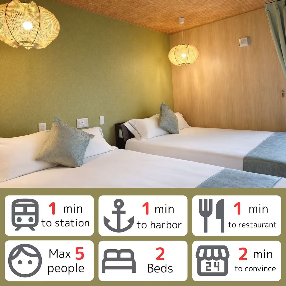 港湾旅馆早川“201”,位于民宿二楼第一间 距JR早川站和海港步行1分、这里可感受轻柔海风,倾听潮汐韵律。是渔船往来宁静又有生机的海港小镇 点击房东主页,查看更多房源。 共5间不同主题房富士 、海 、花月 、潮彩 每间可住4-5人,整栋最多可容纳22人,是亲朋团体入住最佳选择 📍 绝佳地理位置 🚶♂️ 步行1分JR至早川站(东海道线) 🚗 羽田机场驾车80-90分至民宿 🚗箱根湯本驾车10-15分至民宿 从东京出发: 1. 乘坐新干线🚄从东京至小田原(约33分钟) 2. 换乘JR——1站抵达早川(约3分) 3. 步行1分即民宿 前往箱根: 乘坐电车(约3分)至小田原,换乘箱根登山线至箱根汤本(约14分) 前往横滨: 直达电车,约55分 📍是探索箱根、 小田原、 镰仓、 热海、 伊豆半岛完美枢纽 🎣 海港自然体验 步行1分即渔港 岸钓、船钓 步行2分24小时便利店 周边30余家餐厅,新鲜海鲜、拉面,西餐 美丽的海滨散步、 看海上日出🌅、 夕阳落幕 、拍照打卡尽享海景 🏡 房屋亮点 新建 现代化设施 每间独立入口保证私密入住体验