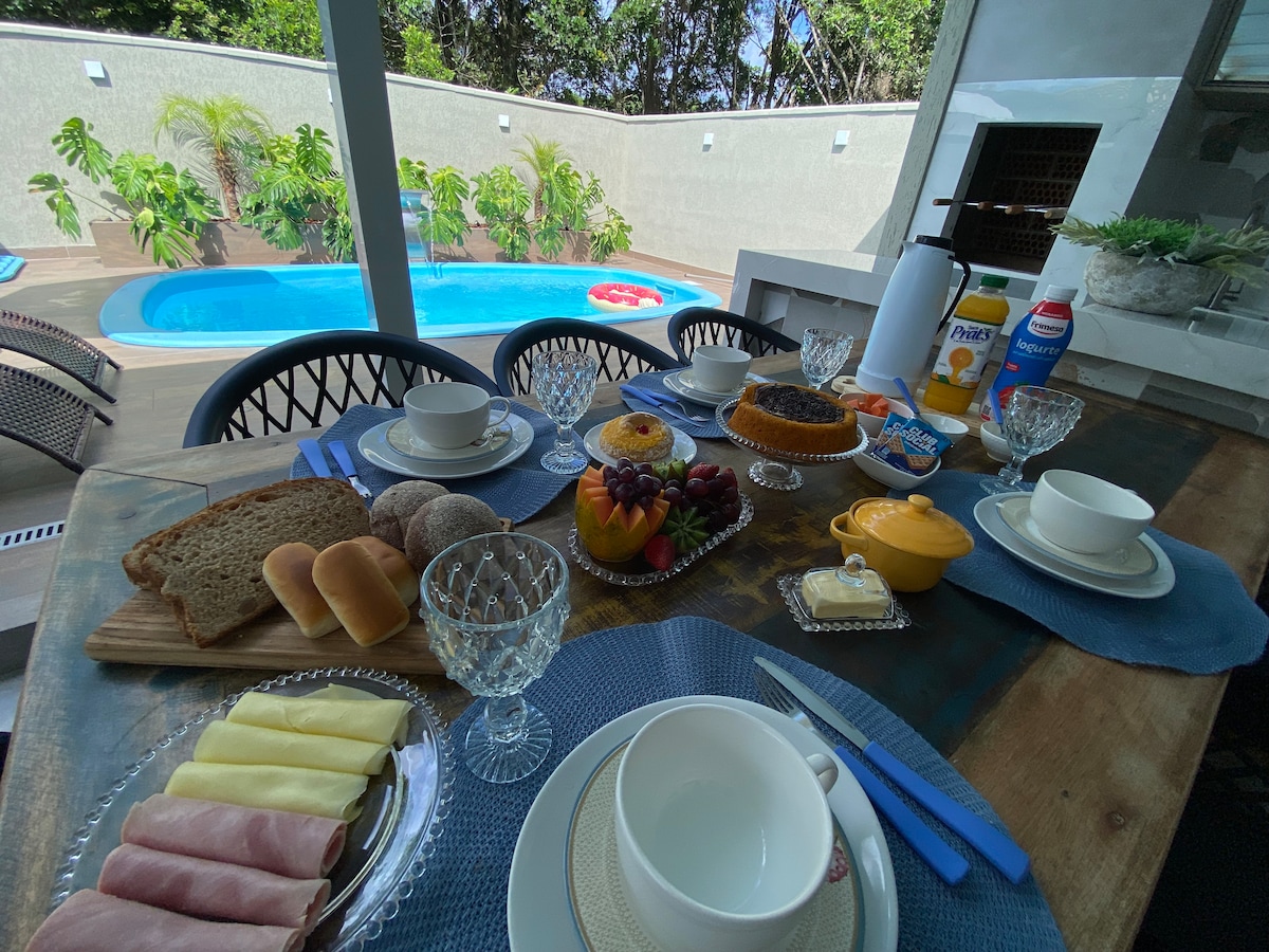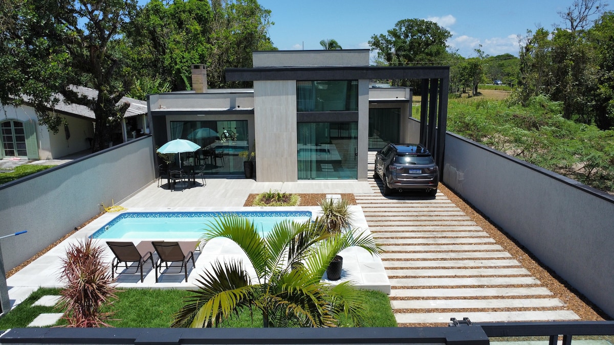 Relaxe com toda a sua família em uma casa nova charmosa e aconchegante. A estrutura é moderna e projetada, piscina com aquecimento solar, área de lazer espaçosa, churrasqueira equipada, quartos com ar-condicionados Daikin acionados via wi-fi, torneiras e chuveiros aquecidos a gás, alarme monitorado 24 horas e câmeras externas. Disponibilizamos carrinho de praia, cadeiras, guarda sol. Desfrute bons momentos. 7 min do embarque para a Ilha do mel.