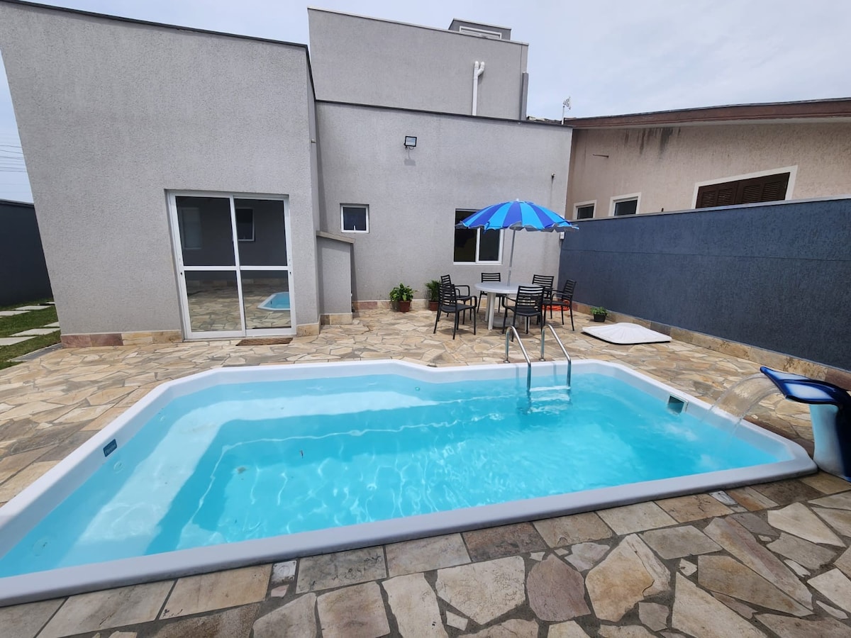 Seu paraíso particular espera em Atami Sul! Casa térrea, acessível, arejada e a apenas 250m do mar. Relaxe na piscina com aquecimento solar e aproveite a churrasqueira! Oferece garagem, Wi-Fi rápido, 2 quartos (1 suíte) com ar condicionado silencioso, sofá-cama, cozinha integrada e máquina de lavar. TV c/ Netflix e Amazon. Sua tranquilidade garantida: 3 câmeras externas ativas. Reserve já!