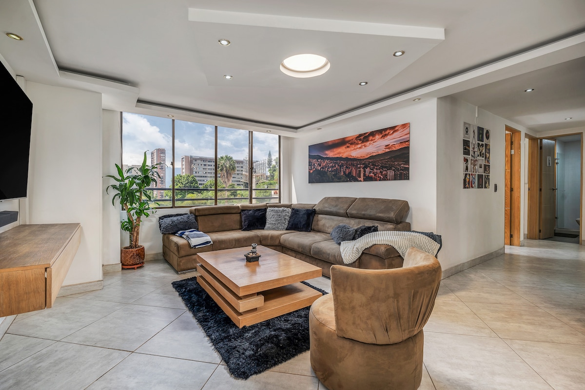 Beautiful new apartment with wide views of the city and its mountains, located in one of the most exclusive neighborhoods of Medellín, Located close to the Eafit University, in a very quiet place, close to Parque El Poblado,Parque Lleras, metro station, grocery stores .Equipped with everything you need to enjoy a pleasant stay. It has a small kitchen with the necessary implements; air conditioning, 200mbps internet, smart TV, private bathroom, large window and more