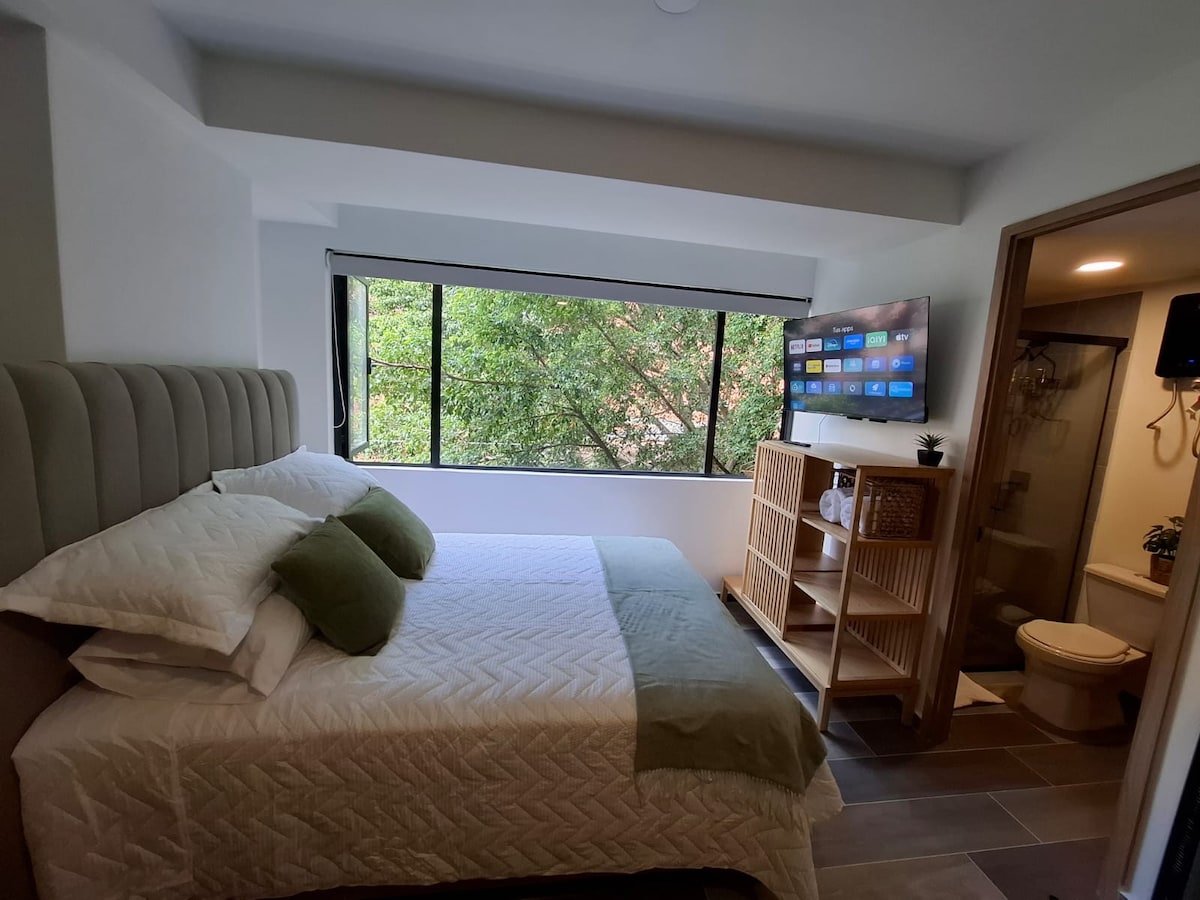 Relax in this elegant, modern apartment in the heart of Manila – El Poblado, just minutes from Provenza, Parque Lleras, and top medical centers such as Clínica Medellín, Clínica Las Vegas, and Clínica El Rosario. ✔Enjoy a king-size bed with premium linens, ✔Stylish bathroom with walk-in shower, ✔Smart TV, ✔High-speed fiber Wi-Fi ✔Fully equipped kitchen. ✔ Private balcony ✔Air Conditioning ✔ Hot Water ✨Perfect for short stays, business trips, or recovery stays.