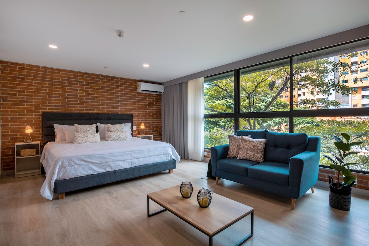 Fully renovated loft designed by Satori Creations in the heart of Poblado-Medellin: ☞ King bed ☞ Air conditioning ☞ Doorman 24/7 ☞ High-speed WiFi 400 Mbps+ ☞ Flat area of Poblado W/distance to Parque del Poblado|Provenza|Manila|Parque Lleras ☞ 8th floor with elevator ☞ 55” Smart TV ☞ Balcony ☞ Monitor ☞ Washer-dryer ☞ Access Metro|Uber ☞ Luggage storage at checkin/out ☞ Free parking ☞ Yoga & meditation room at the Rooftop ☞ Best Restaurants|Markets|Bars|Discos|Coworkings|Coffees ☞Safe