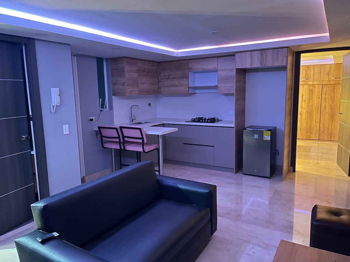 Suite completamente amoblada de 28 m2, con aire acondicionado y cocineta. Ubicada en una de las mejores zonas de Medellín, en un barrio muy tranquilo y cerca de todos los sitos de interés. La Suite cuenta con una vista espectacular a la ciudad y a las montañas. Podrás hacer uso de la zona de coworking, gimnasio y un espectacular café que ofrece diferentes tipos de bebidas a base del mejor café colombiano, podrás disfrutar de tu bebida en la terraza que se encuentran en el 2do piso del edificio.