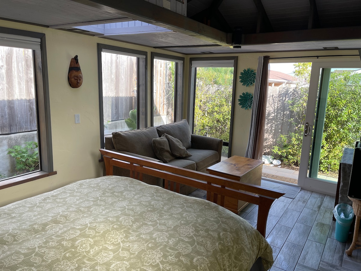 This light and airy hideaway was designed and built by the host incorporating her own handiwork in art and furnishings. Initially a granny flat, it's been transformed into a comfortable and spacious hang out. Its central location makes it ideal to explore the area. There is plenty to do on site; barbecue, play corn hole or horseshoes have fun with games and cards kept in the hall, enjoy the pool and hot tub in the warm season. May to Sept. The twin beds can be easily configured to a king bed. Price includes a 13% local occupancy tax. Your cottage opens up to the pool area which maybe available during the summer months but not guaranteed as this pool is too deep for kids to stand in. There is also a hot tub open from March to Dec. So the key to open the pool is subject to conversation. The pool is shared with us. No parties please. This is a non smoking property. We love dogs but we can not allow pets brought in. We have a large dog and cats. We kindly ask for slow driving up and down driveway as the animals are slow to move as they own the space. These are accommodations you wont find at a hotel. We are not one, this is our home we are opening to share with you. We are next door most times if you have any questions otherwise we will respect your privacy. The guest house sits on three acres with the main house where the host lives with her husband. It is just one and a half miles to the freeway and town. Four minutes to restaurants and grocery stores. There are chickens, 2 baby gosts, and a rabbit on the property along with cats and a large dog, Jules, who is sure to greet you. The pool will be opened to guests that can swim only as the shallow end is quite deep. Opened when the temperature increases in the summer months. A cold pool is no fun to swim in. The hot tub is open in March to Dec. Contact hosts if plan to use.