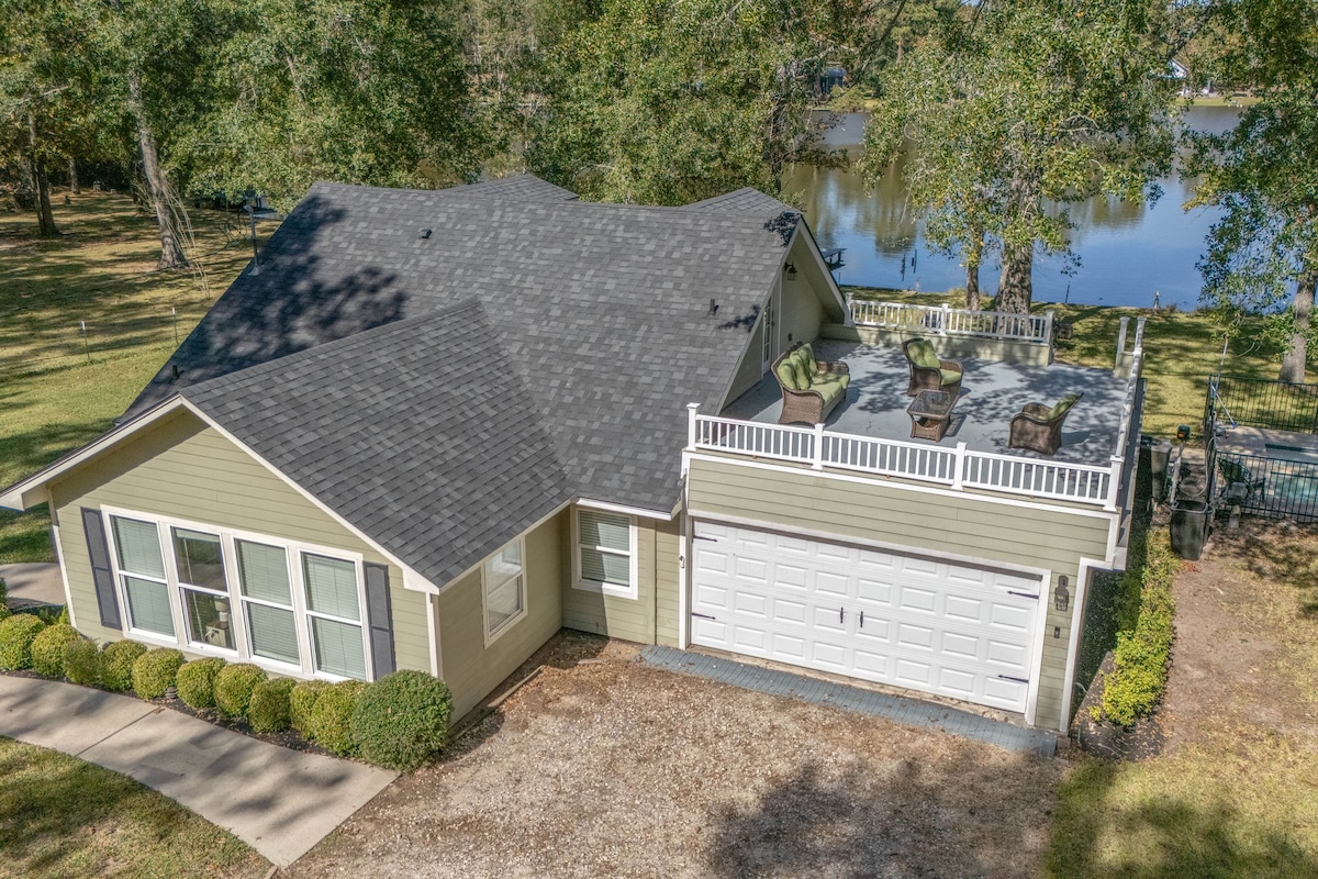 Relaxing waterfront home with the best sunsets on Lake Houston. Updated, modern rustic home with open living and oversized deck, perfect for quality time with family or friends. Fully stocked kitchen with SS appliances, ice maker, drink cooler, wine fridge, and oversized kitchen island. Fish or swim off the long dock with stairs into water, and rinse off in the outdoor shower. SmartTVs provided in all bedrooms and living room with surround sound speakers in indoor and outdoor living spaces.