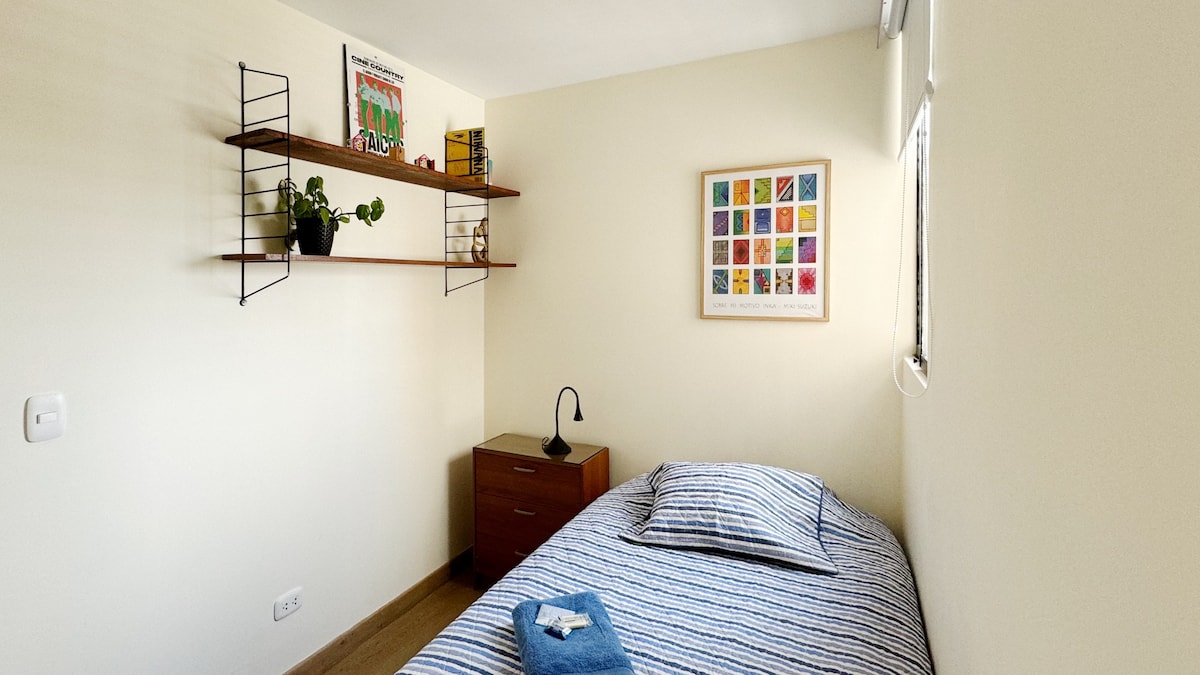 Mini depa privado e independiente en segundo piso (acceso con escaleras) completamente amoblado, consta de tres ambientes: Dormitorio con cama queen size, amplio closet y escritorio, Wifi fibra óptica, Smart TV 50” con WinTv, tiene vista a la piscina, jardín y parque. Cocina/comedor, 1 sofá cama y al lado baño completo privado. El barrio es tranquilo y seguro. Vigilancia privada. Cerca de avenidas con trasporte público, hay lavanderías, banco BCP, bodegas, restaurantes y farmacias.