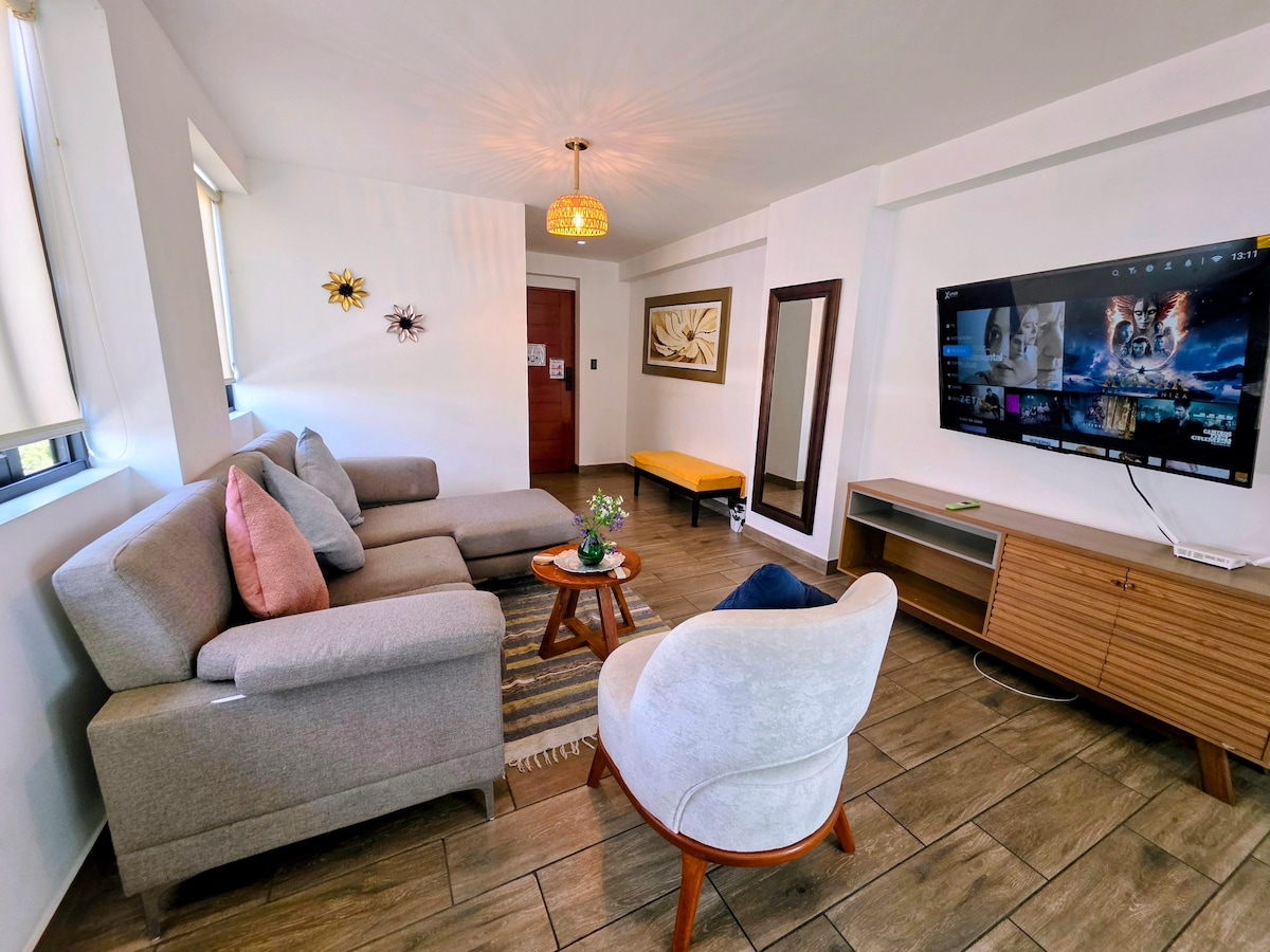 Modern fully furnished apartment, ideal for long stays. Features high-speed Wi-Fi, a 65” Smart TV with Netflix and Disney+, a fully equipped kitchen with espresso machine and water filter, washer-dryer, queen-size bed, and a balcony. The building offers a swimming pool, gym, and coworking area. 24/7 self check-in, smartkey, free parking, and 24-hour security. Strategically located in San Miguel, close to universities and shopping centers, and less than 20 minutes from the airport.