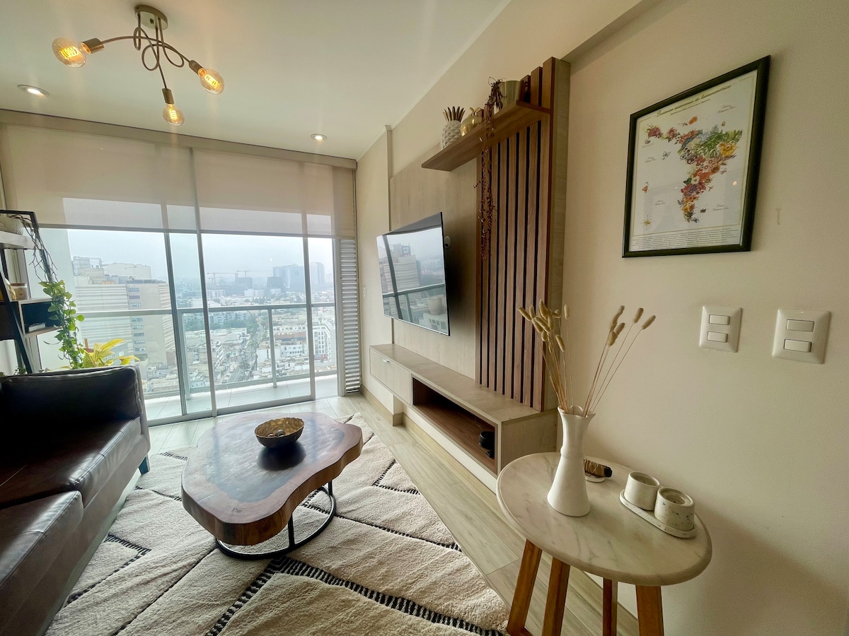 Es un apartamento cómodo, ubicado en el centro de miraflores a 1 cuadra del malecón, muy cerca a restaurantes, centros comerciales (larcomar), lugares turísticos, playas, entre otros. De 90 m2 de amplitud con 1 cama, 1 baño completo y 1 medio baño, 1 cocina, sala y comedor. El apartamento está en un sexto piso con ascensor. Un lugar muy acogedor y en uno de los distritos más importantes de Lima.