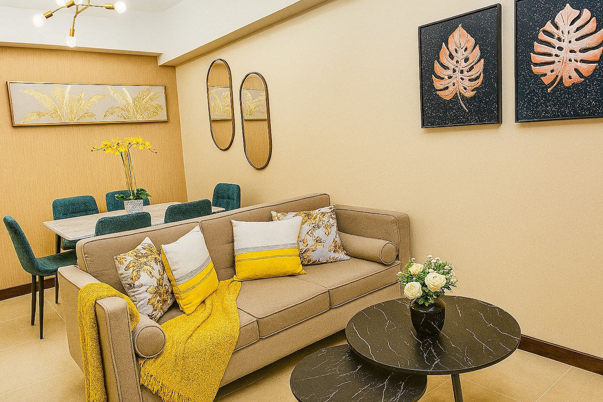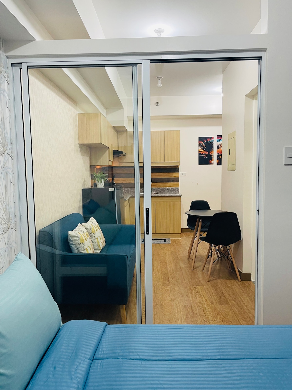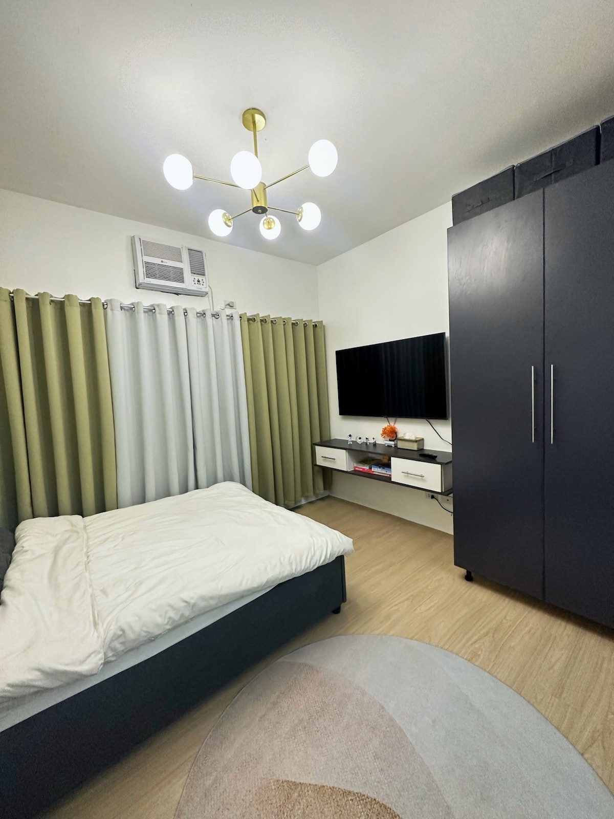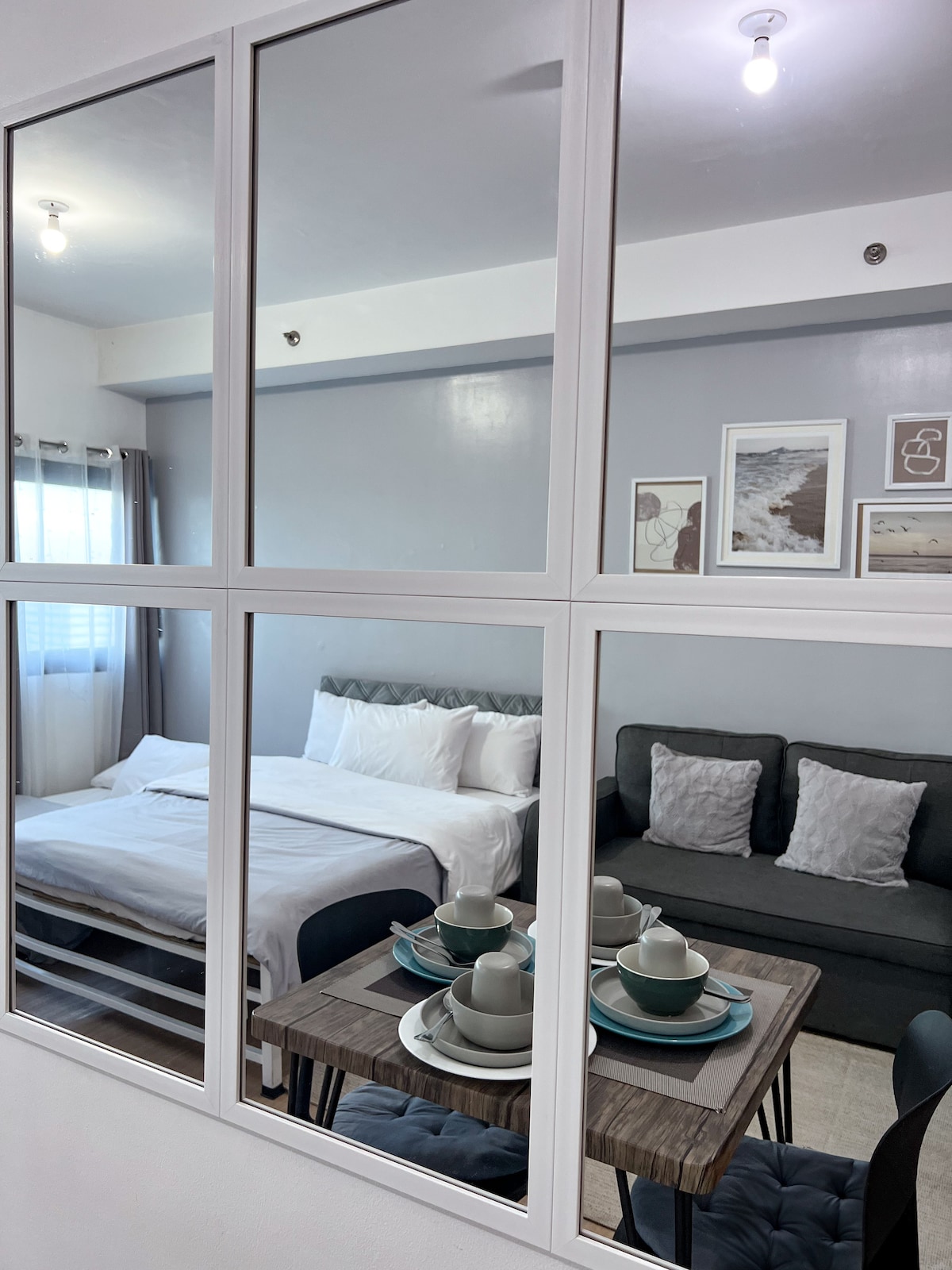 Relax with the whole family at this peaceful place to stay Bedroom Double size bed with Foam Mattress 4 large pillows 1 comforter + linen Smart Tv with Netflix Wifi Side table Aircondition Living/Dining Sofa 2-seater Dining table and chair Refrigerator Microwave oven Induction cooker Rice cooker Kettle Pot Mugs / plates / spoon&fork Trash Can 2-Mirror Bathroom Bidet Mirror Sink Water heater Shower telephone Trash Can One-time set up and freebie 2bottled water 1tissue roll SELF CHECK-IN