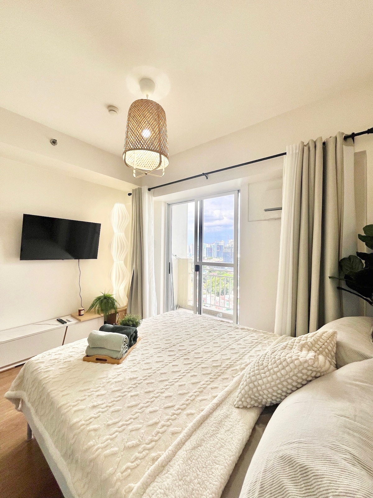 Modern 1BR Smart Home @ Infina Towers | Garden Floor 🏠✨ 28sqm high-tech staycation/WFH space on a rare Garden Floor. Balcony with pool view! ⛲ ✅ HIGHLIGHTS: 🔹 Self Check-in: Smart Lock 🔑 🔹 WiFi: 200mbps Fiber ⚡ 🔹 Health: NanoeX Aircon (Kills viruses) 🌬️🧼 🔹 Location: 3-5 min walk to LRT2 Anonas 🚶 💰 PAID ADD-ONS: 🚗 Parking: 250/day (Car) | 150 (Motor) 🐾 Pet Fee: 300/pet (Under 5kg) 🏊 Pool: 200/head (Mon, Tue, Wed, Fri ONLY) Book Muffin's Place today! 🧁