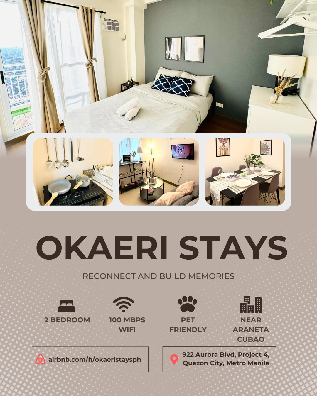 10-minute RIDE to UP, ARANETA CITY & ATENEO! BOOK NOW! Welcome to our elegant urban hideaway, located in Aurora Blvd., Quezon City. Our well-designed condo unit offers the ideal balance of contemporary elegance and cozy comfort. This comfortable area has a fully functional kitchen, tastefully chosen furniture, and a welcoming bedroom for a good night's sleep. It offers convenient access to Quezon's attractions and is situated in a desirable region. This is your home away from home. Welcome.