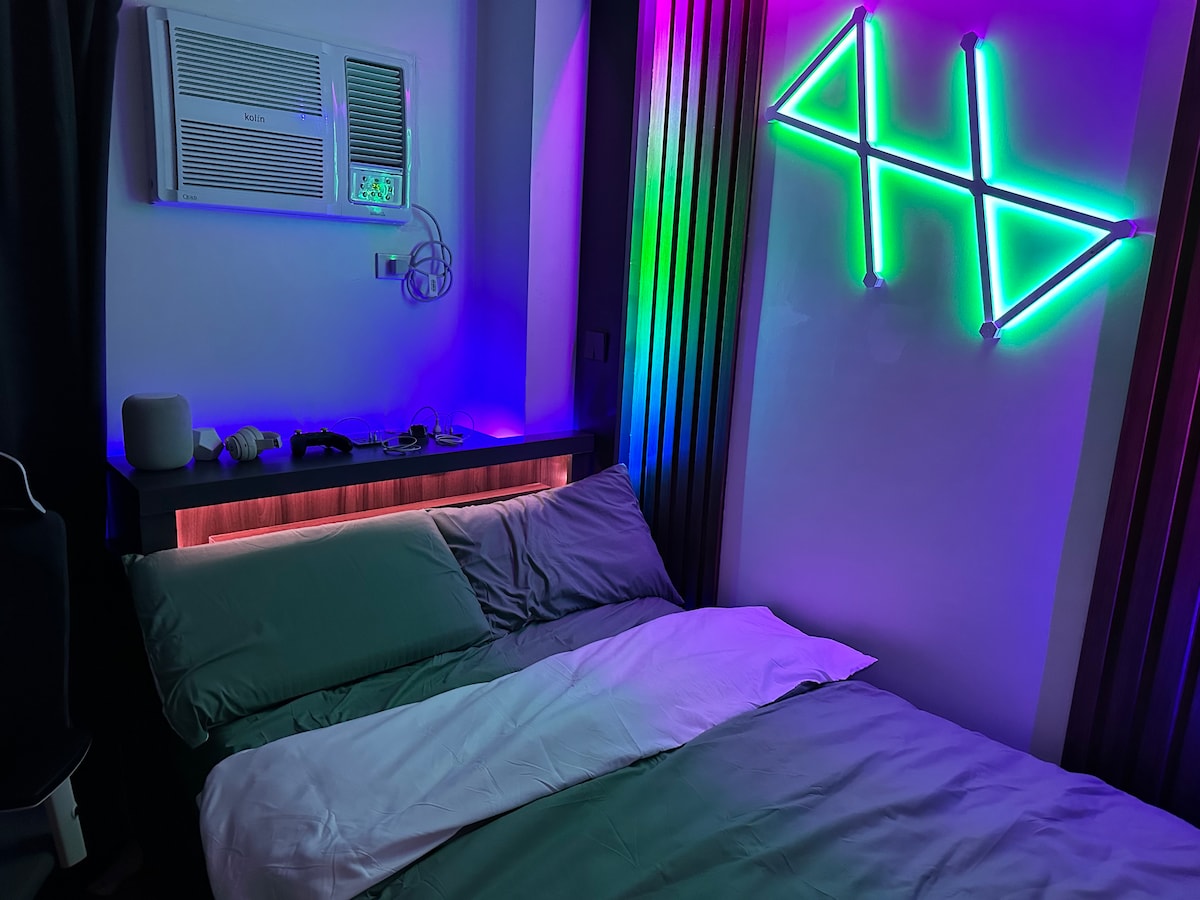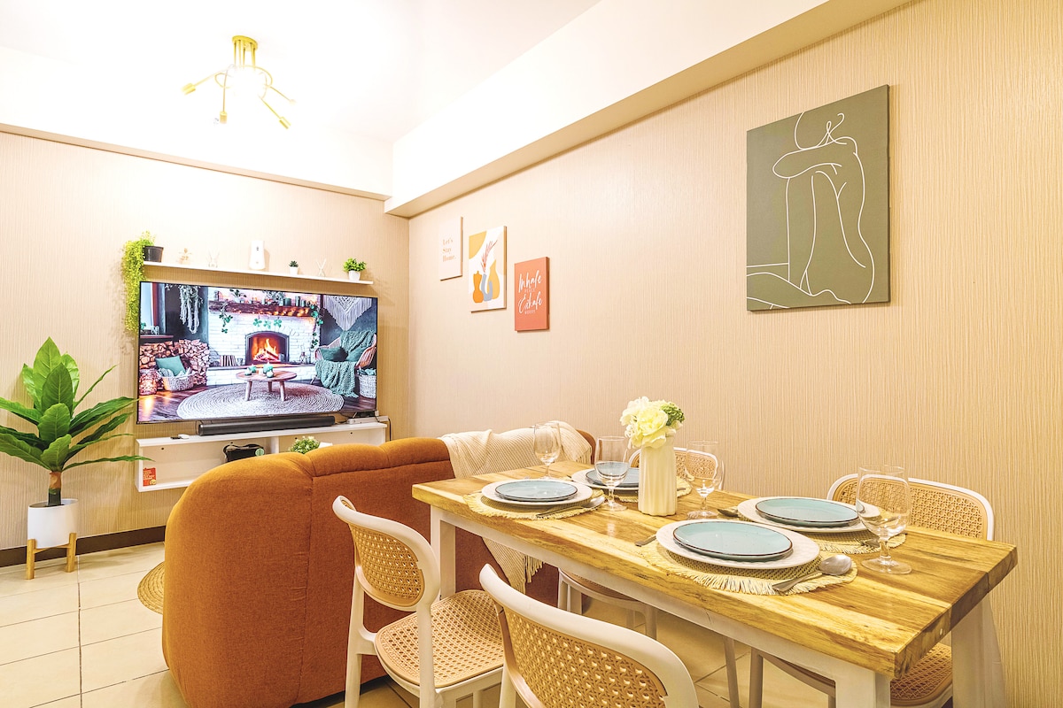📍 Stylish 34sqm studio designed for comfort and convenience: Queen-sized bed Double-size airbed 65” Google TV, PS4 Pro, and board games Fully equipped kitchen and dining area Modern lighting and built-in outlets 🏖 Amenities: FREE pool access Fitness gym Basketball court Jogging trail Secure paid parking & 24/7 security 🧴 Guest Kit Provided: Dental kit Round soap Slippers Bath towel ⚠️Note: Tissue and dishwashing liquid are not included. 🔑 Hassle free self check-in and check-out.