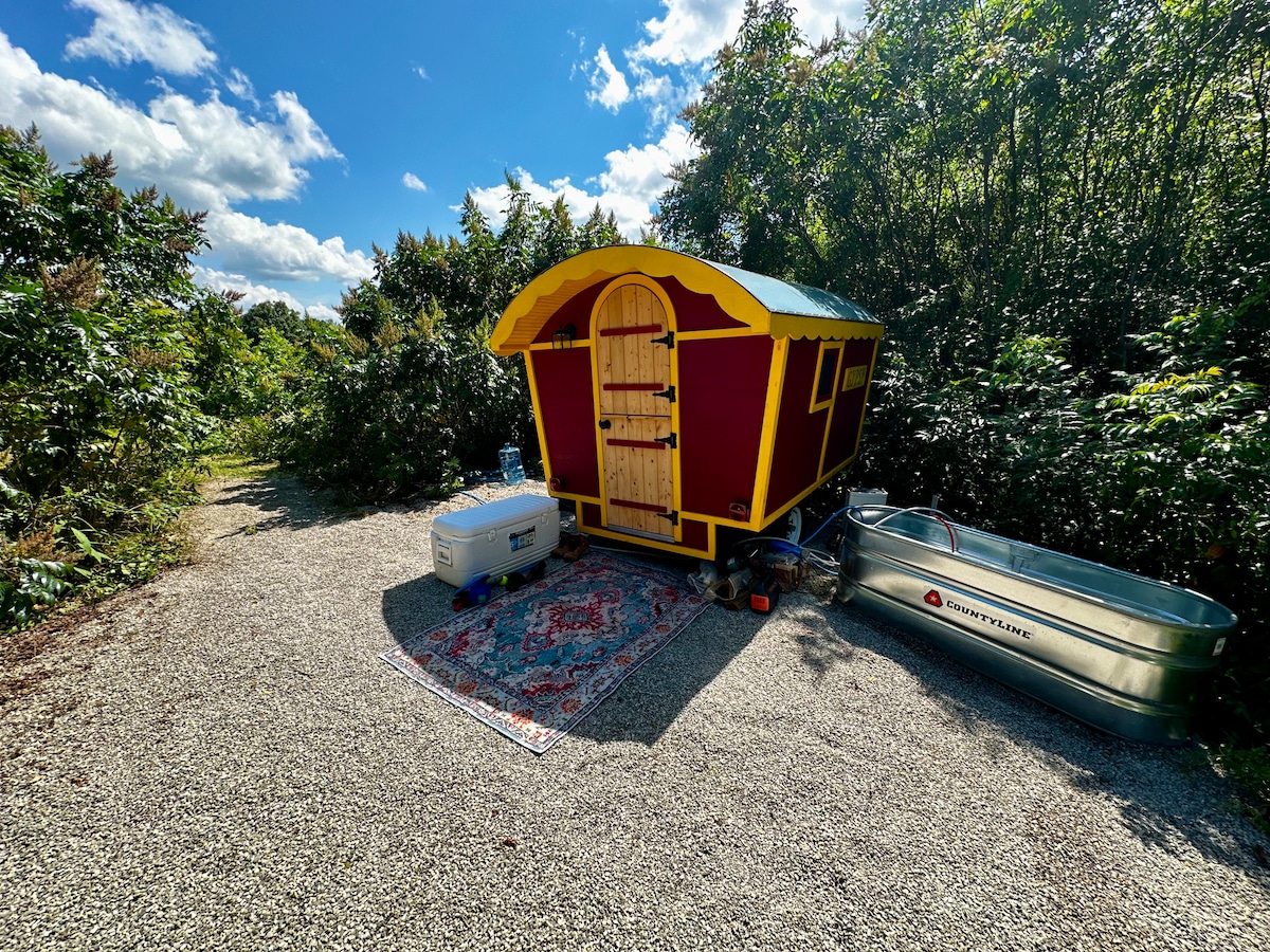 Our Shepherd’s Hut/Vardo “Bohemian Betty” is a fun getaway for a single traveler, couples, or two friends. Nestled among nature, you’ll find a covered space with an outdoor cooking space. There is also a hot water outdoor shower (late April to late October), a hot tub that gets freshly filled for each guest, and a restroom with sink. The site is fully solar powered and your space is air conditioned, has a mini fridge, and comes with coffee and tea supplies, and an outdoor kitchen with sink.