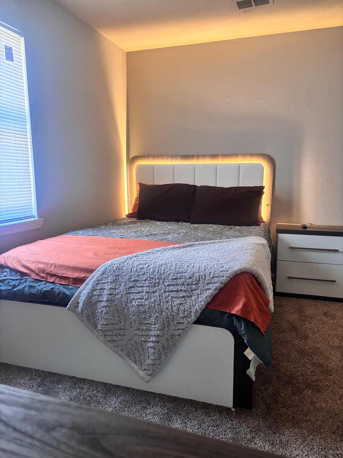 舒适现代卧室,配有柔和照明/舒适毛绒