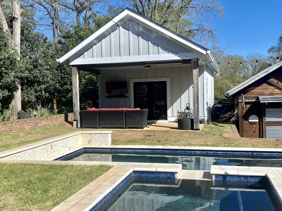 Unwind in this midcentury modern pool house in Five Points in Athens, GA. You'll have the pool to yourself, all 55,000 gallons of it plus a hot tub, steps away from a comfy king-sized bed. This is a brand new building with a kitchenette, grill, outdoor shower, a screened porch, and is solar powered. Tesla charger available. You'll see deer every morning and evening and maybe a famous football coach who lives nearby.