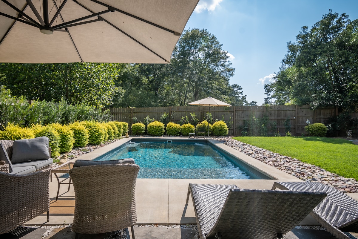 Unwind in this midcentury modern pool house in Five Points in Athens, GA. You'll have the pool to yourself, all 55,000 gallons of it plus a hot tub, steps away from a comfy king-sized bed. This is a brand new building with a kitchenette, grill, outdoor shower, a screened porch, and is solar powered. Tesla charger available. You'll see deer every morning and evening and maybe a famous football coach who lives nearby.