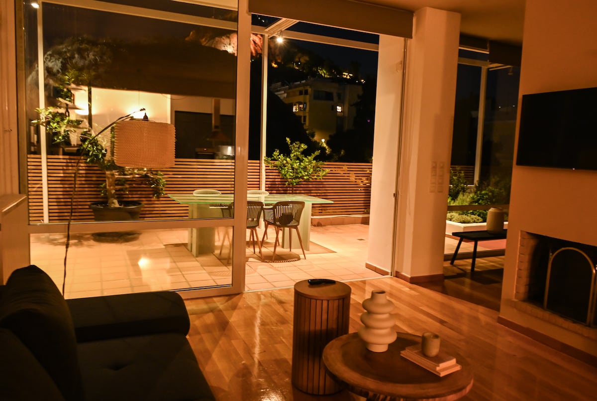 A truly unique royal-style penthouse just 8 min from Athens Airport. Like a private museum, it features antiques, oversized 200×220 beds, a large private terrace, and access to the rooftop for panoramic views and plane spotting. Ideal for families, with plenty of space and character you won’t find anywhere else in the area. Glass doors flood the space with natural light and frame the open sky — a one-of-a-kind stay that blends classic charm with rare city views.