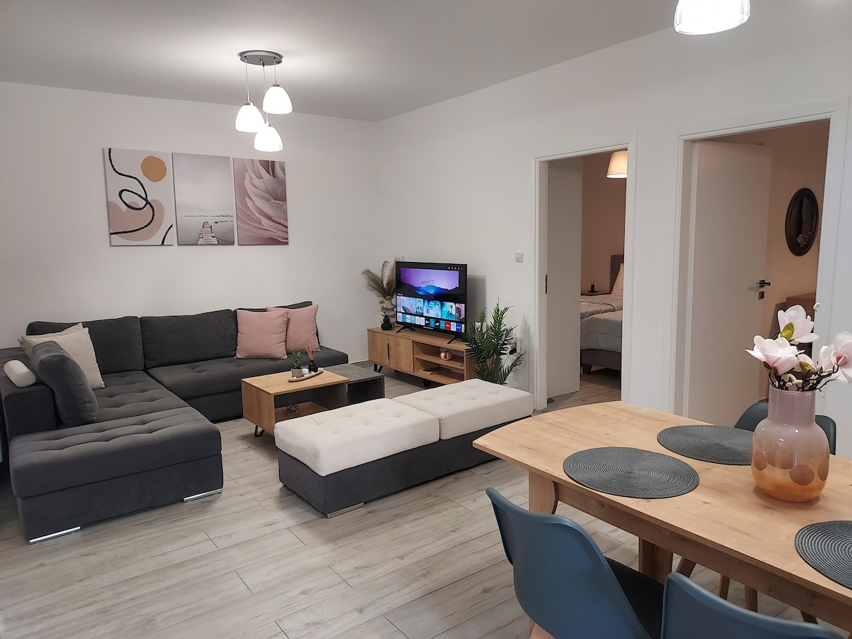 Xenios Zeus is a modern newly-built appartment in Rafina 80 sq.m. It includes 2 big bedrooms one of which is a master bedroom with wc, one big living room, one modern kitchen,one big bathroom and all the comforts mentioned in the description. It's 35 metres far from Marikes beach. It has a-500 s.q. garden, a barbeque and a private parking 80 sq.m. It is 2 km far from the port of Rafina and the city, 15 km from the national airport of El.Venizelos and 40 km from Athens and the Acropolis.