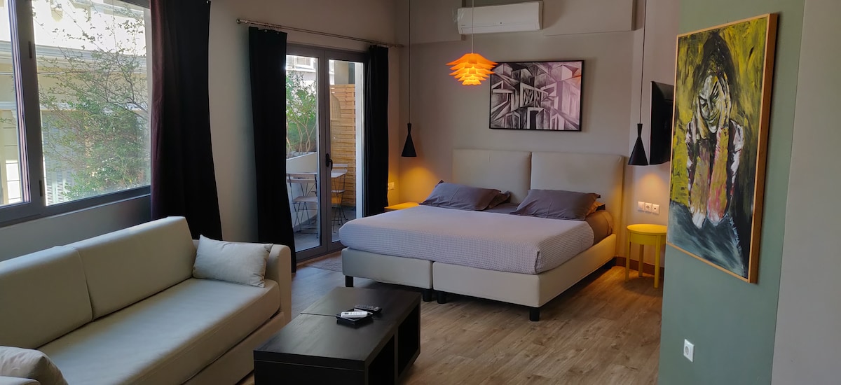 Welcome to the Garden Suite at Urban Serenity Suites – a modern, self-contained space in the peaceful suburb of Argyroupoli, Athens. Just minutes from the metro and with easy access to the city center, airport, and southern coast, this suite is perfect for both business and leisure travelers. Whatever brings you to Athens, you'll enjoy the privacy, style, and comfort of your own private courtyard – ideal for relaxing – along with access to a quiet, semi-private pool just steps from your door.