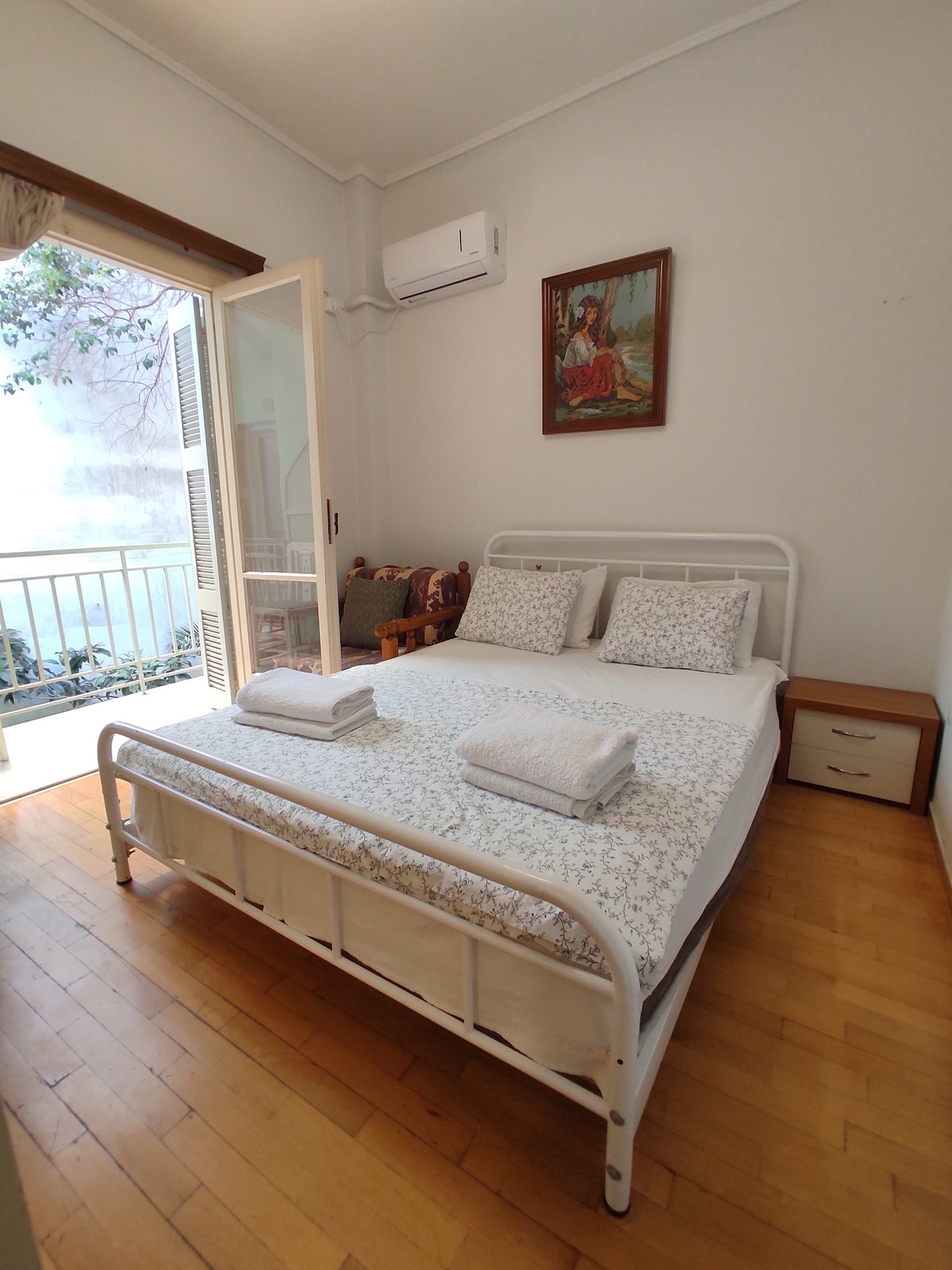Bright Room with Balcony near Metro Enjoy a cozy stay in our family guesthouse in Athens, just a short walk from Agios Nikolaos metro. The room features air conditioning, a private kitchen, fridge, washing machine, wardrobe, and a sunny balcony — perfect for relaxing after exploring the city.