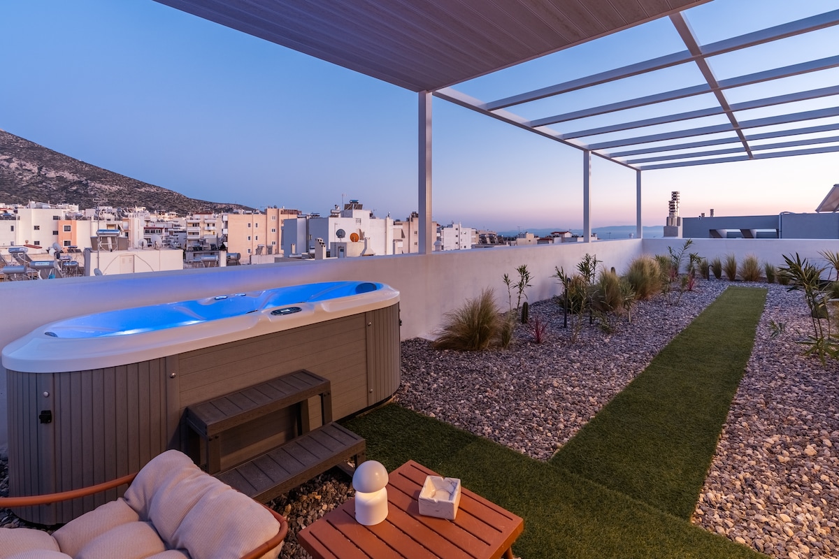 Welcome to Ether Rooftop Spa. Newly built with eco friendly materials, sixth floor penthouse with 70 sq.m. private terrace equipped with a premium spa/hot tub and sauna. Located in the Athenian Riviera, in the upscale suburb of Glyfada. Spacious open living room and kitchen, equipped with the latest appliances. One spacious bathroom and a comfortable bedroom. The house is also only decorated with paintings from a profound local artist. Able to accomodate 2 guests. Indulge in C47 tranquility.