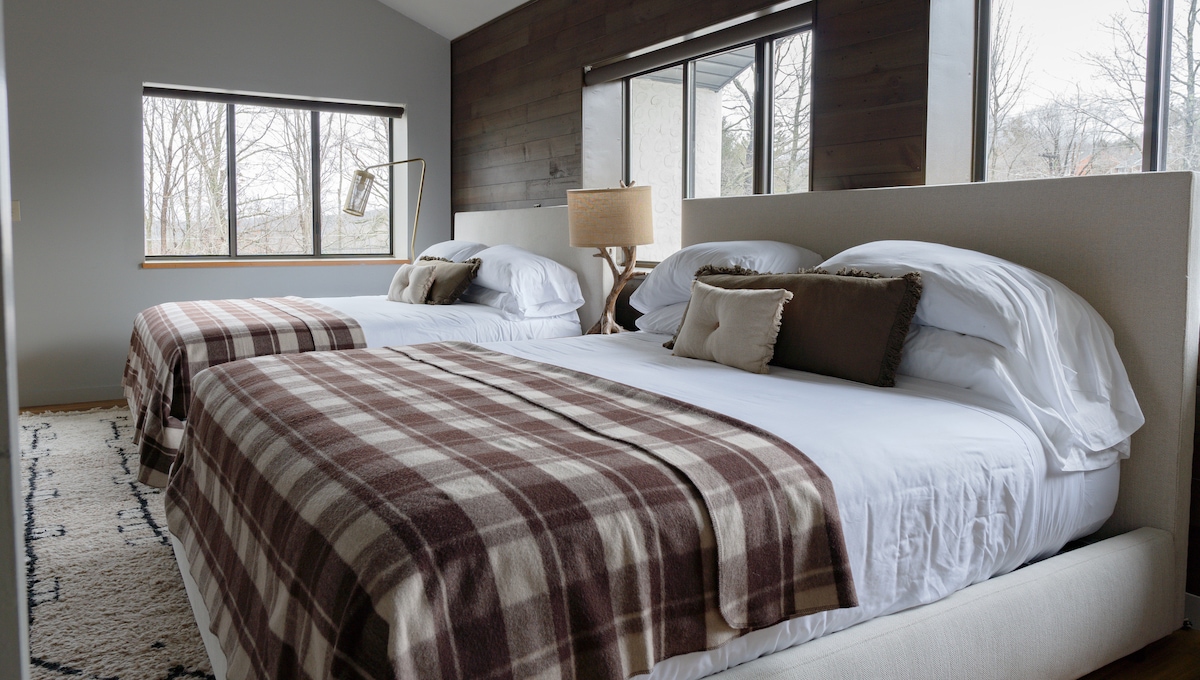 Merging the rustic charm of an alpine lodge with the magic of mid-century Berkshires, our 400 sq. ft. King rooms are lined in mushroom wood, outfitted with a custom twin daybed, and accented by original artwork. Built in storage and a private terrace or patio ensure you can make the most of your mountain stay. Mini fridge and Keurig included!