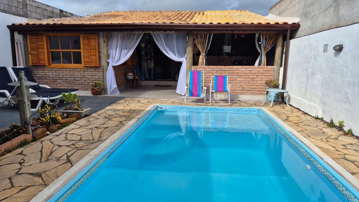 Casa Aconchegante Charme e Luxo envolvem esta Acomodação, cm Vista da Piscina e um lindo Por do Sol. Duas Suítes cm ventilador de Teto Sala Ampla cm Lareira Mesa de Jantar Mesa de Bilhar Cozinha Gourmet conceito Aberto Redes e Móveis de Piscina Chaise na área externa beirando a Piscina Campo 400 Mts para seu Pet e crianças Fogueira Externa Cercada para Pets Delivery de entregas na Porta da Casa Loteamento cm Portaria Somos Petyfriendly Não esta disponível Lençóis, fronhas e toalhas