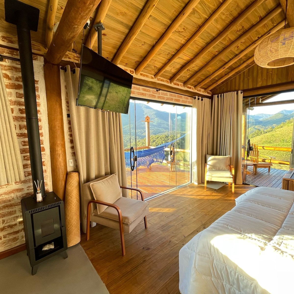 Descubra a magia da Serra da Mantiqueira nesta cabana projetada para que você possa contemplar o nascer do sol sem sair da cama. Venha relaxar em nosso spa aquecido, observar as estrelas na rede suspensa e balanço. A cabana possui um quarto integrado com uma aconchegante cama Queen. Na sala/cozinha, um futon super confortável acomoda mais dois hóspedes, tornando a experiência ideal para famílias. A propriedade também conta com trilhas e pequenas quedas d'água. Este sítio é um refúgio único.