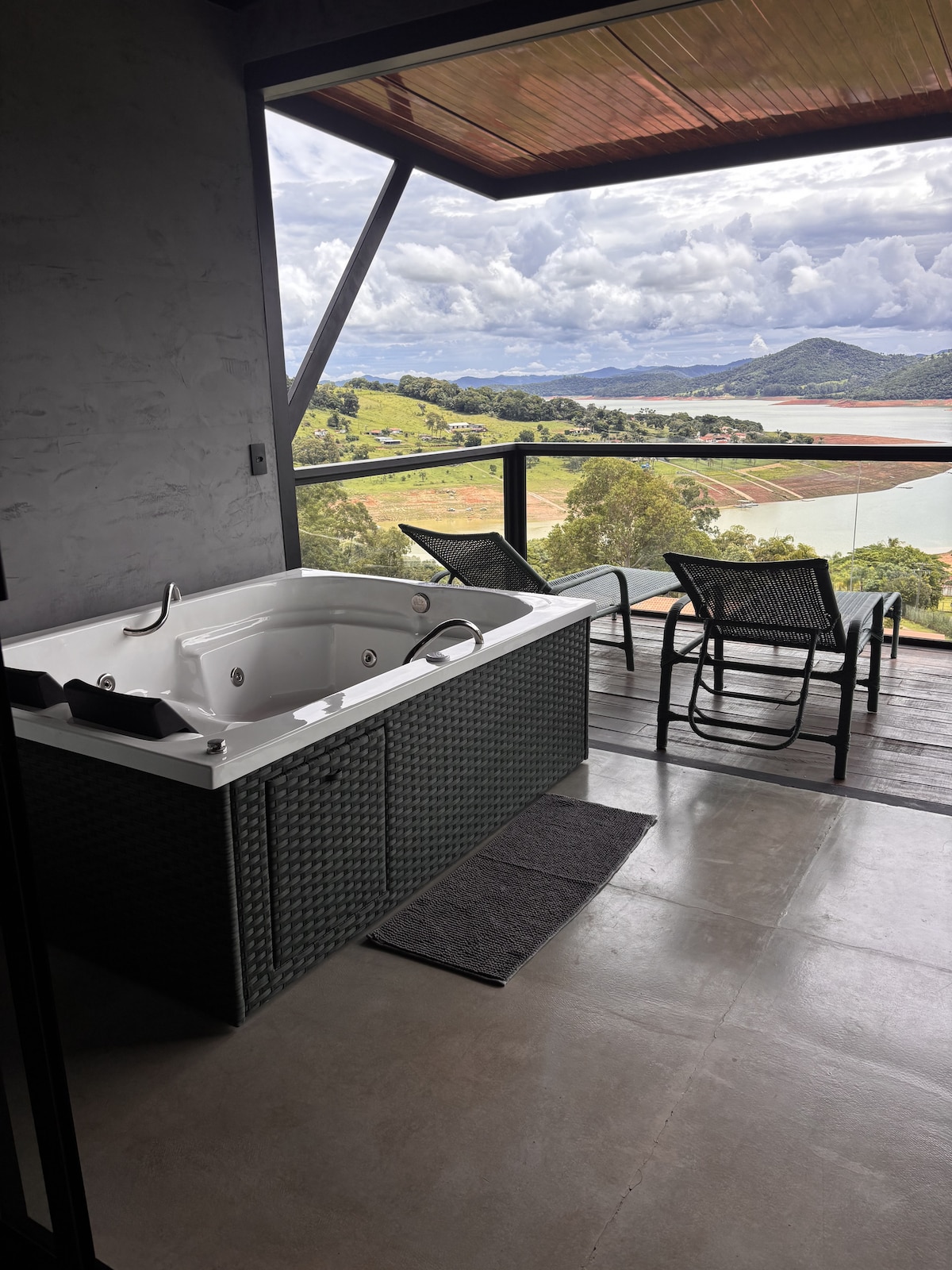 The Chalé Oficina invites you to live special moments in the Serra da Mantiqueira with comfort and charm of the decoration signed by Studio Szabó. On the deck, laze in the double chaise watching the sky full of stars, enjoy a ground fire, relax in a natural water hot tub bath or if you have the courage, take a waterfall bath from the site. We are in a private reserve of the Atlantic Forest, surrounded by the mountains of Pouso Frio, close to the village that has its charm, worth discovering!