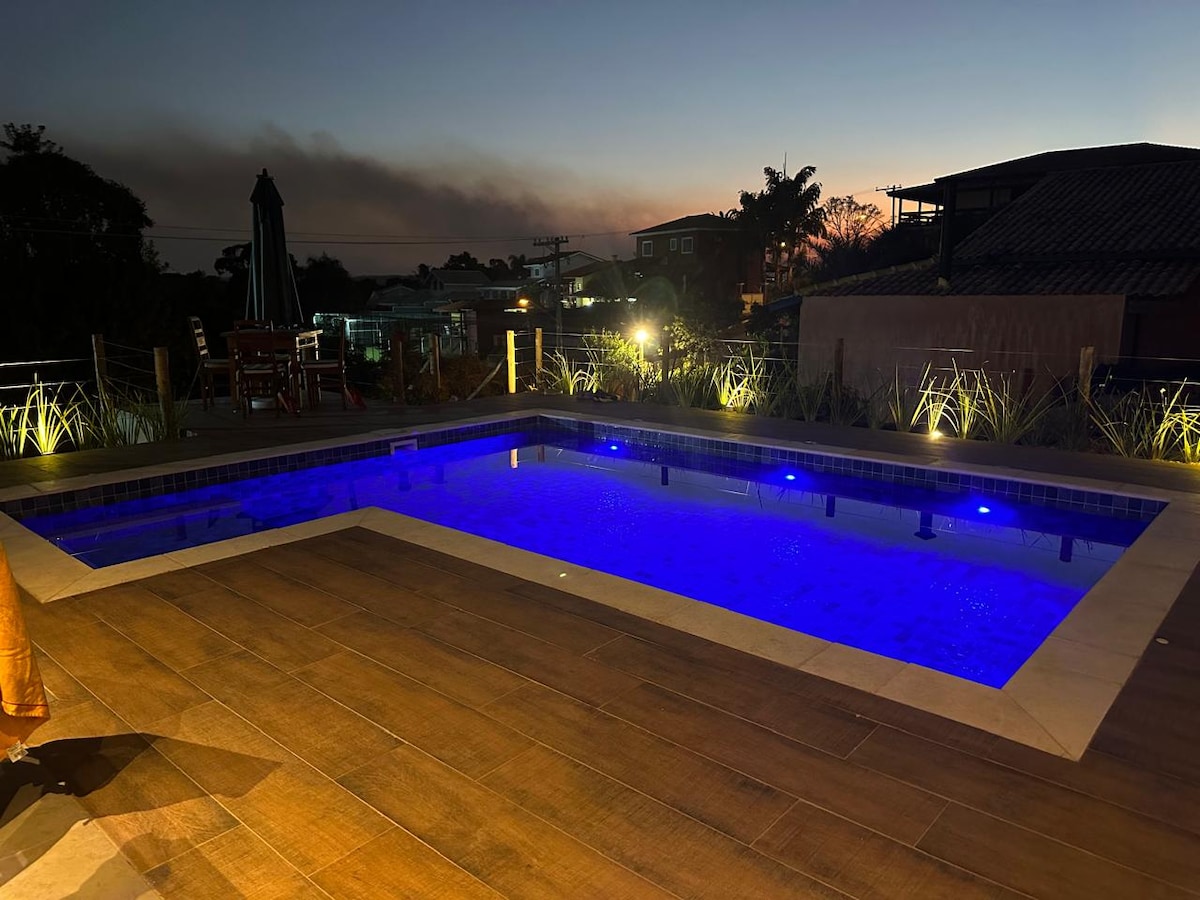 - Casa com excelente área externa de lazer, piscina com aquecimento solar, churrasqueira, fogão a lenha, mesa de sinuca, banheiro, ducha, jardim e muito conforto. - 5 quartos (1 suíte) com ventilador, 4 banheiros, sala de TV com lareira, sala de jantar, cozinha espaçosa com filtro de água e lavanderia. -Possui dois freezers (sendo um na área externa). -Possui 3 mesas grandes para jantar / almoço (duas externas e uma interna). -Casa toda cercada por muro e portão altos. -Garagem p/ 5 carros.