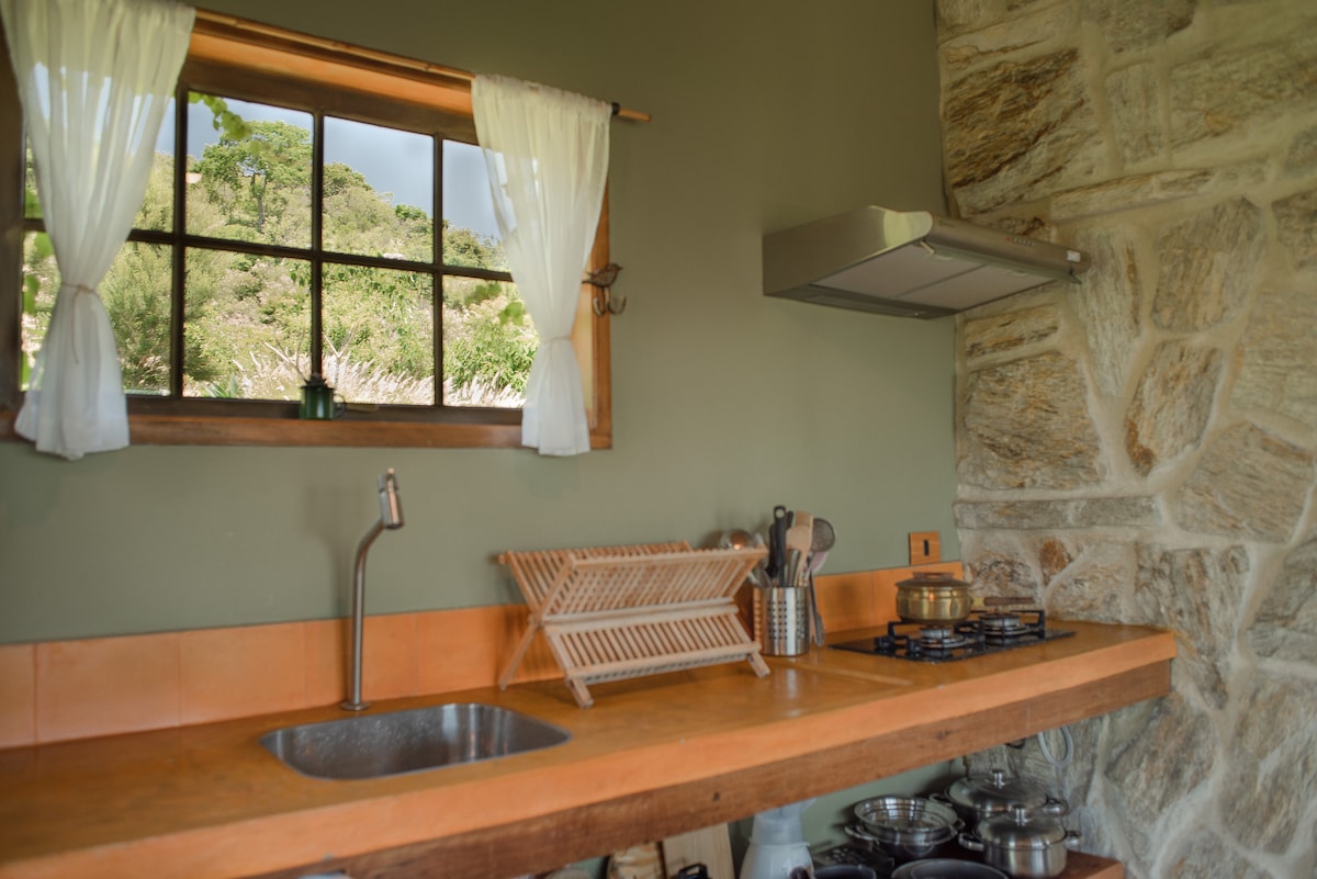 O Grappolo tem uma vista incrível, foi inspirado nos antigos vilarejos europeus. Paredes de pedra, madeira, moveis, livros, decoração e objetos do acervo da família. Sala com lareira divide o espaço com a cozinha equipada. O visual do quarto continua maravilhoso com a porta para o deck. Nosso desejo é, dividir a experiência nesse lugar muito especial, proporcionando a reconexão com a natureza, som dos pássaros, ar puro do alto da montanha, infinitos tons verde e azul, tranquilidade e silêncio.