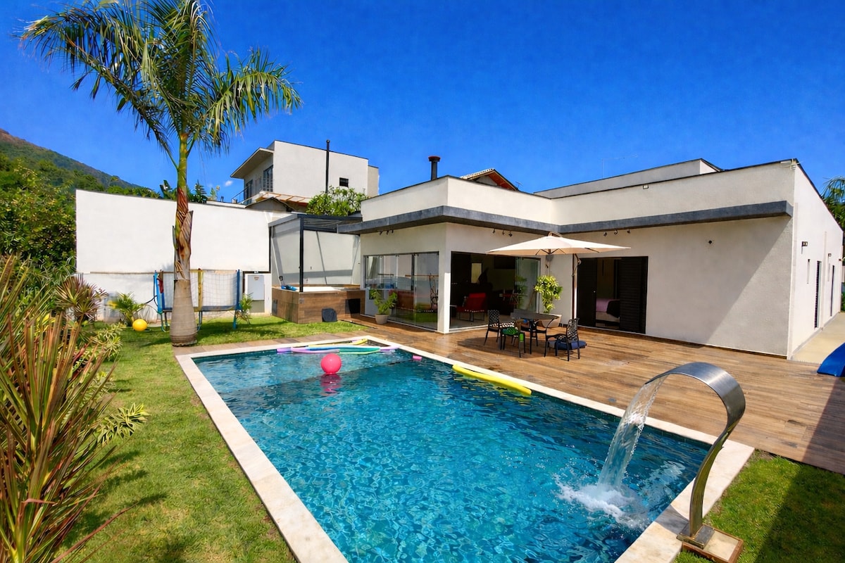 Mountain house in contemporary style, clean and comfortable, located 1 hour from the center of São Paulo. Good architecture, north face and double height foot, built in stone, wood and glass. Land of 42 thousand m2, in reserve of Atlantic forest, with stream of clean waters, shower and natural pools. Cozy setting of total tranquility and privacy. Perfect for weekends, due to proximity. And delicious for holidays and extended holidays.