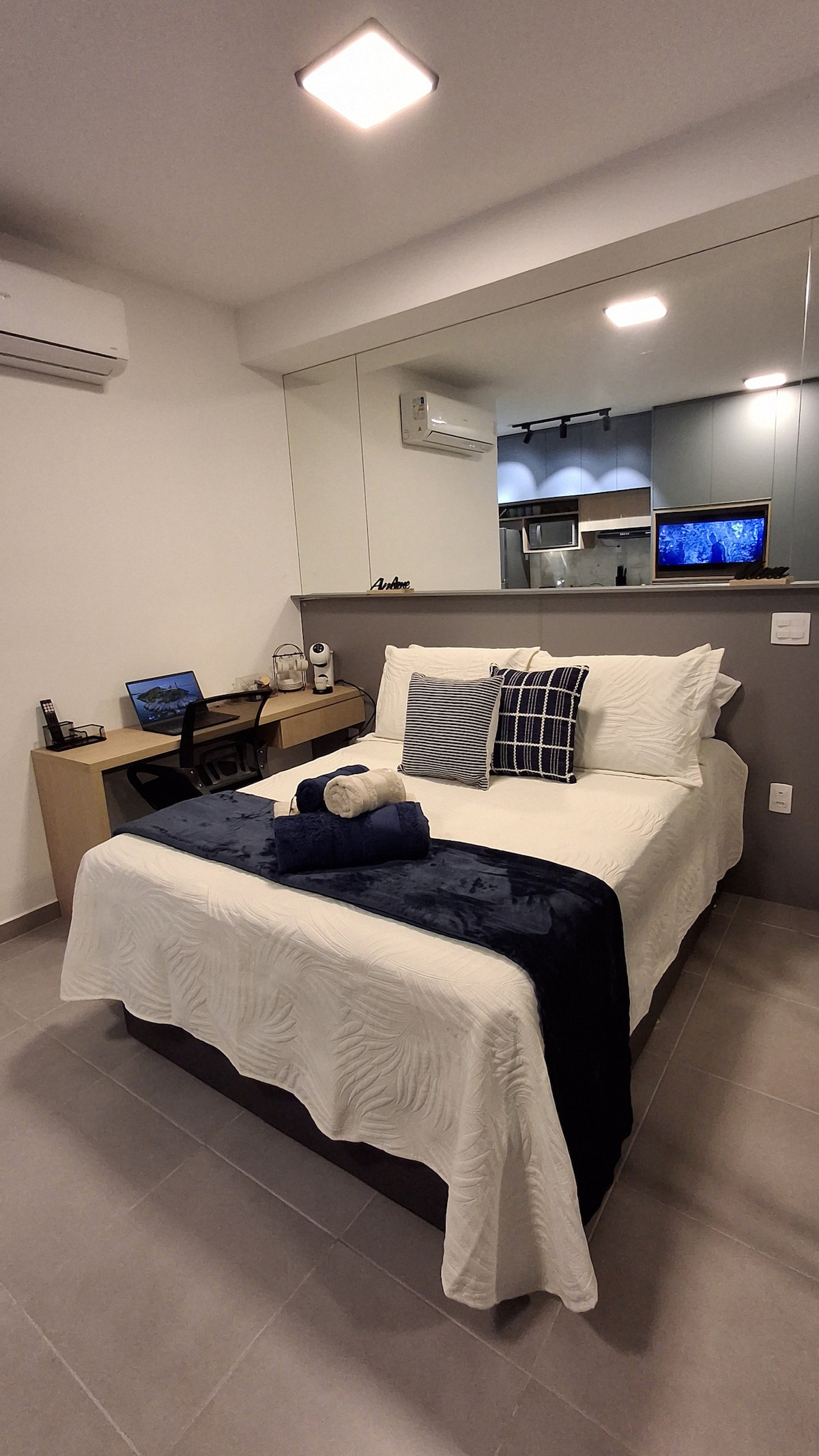 Viva a conveniência de Alphaville com o acolhimento que você merece! Cada estúdio desta categoria possui uma curadoria decorativa própria — mudando um quadro ou uma cor — mas sempre garantindo a mesma configuração impecável: cama Queen super macia, ar-condicionado Split, cozinha completa com indução e uma charmosa sacada. Localização Imbatível: a passos do Centro Comercial, restaurantes e mercados. O prédio oferece restaurante, lavanderia e mini mercado.