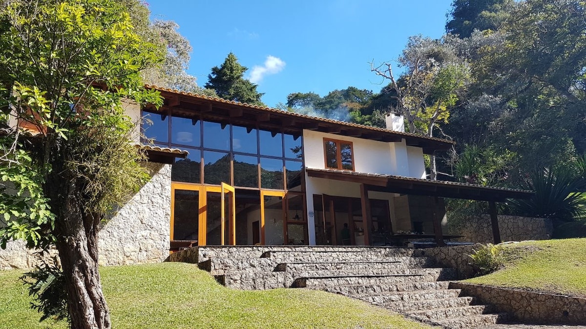 Mountain house in contemporary style, clean and comfortable, located 1 hour from the center of São Paulo. Good architecture, north face and double height foot, built in stone, wood and glass. Land of 42 thousand m2, in reserve of Atlantic forest, with stream of clean waters, shower and natural pools. Cozy setting of total tranquility and privacy. Perfect for weekends, due to proximity. And delicious for holidays and extended holidays.