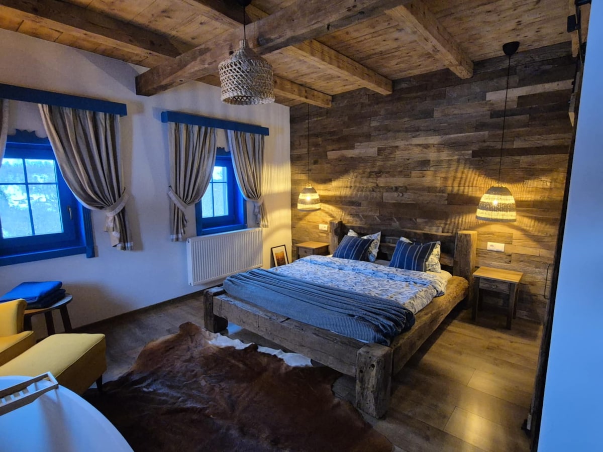 It's a "mountainous village at the end of the world". Our guesthouse is a new building, but we reused few materials from the old house which was standing beforehand (materials like brickets, timbers, big stones...). The interior of the house is in vintage style, furnishing made of different woods, like pine tree, oak tree, nut tree. Every room has a different interior design as well as the bathrooms. My husband has a furniture factory so they made all the things which is made out of wood.